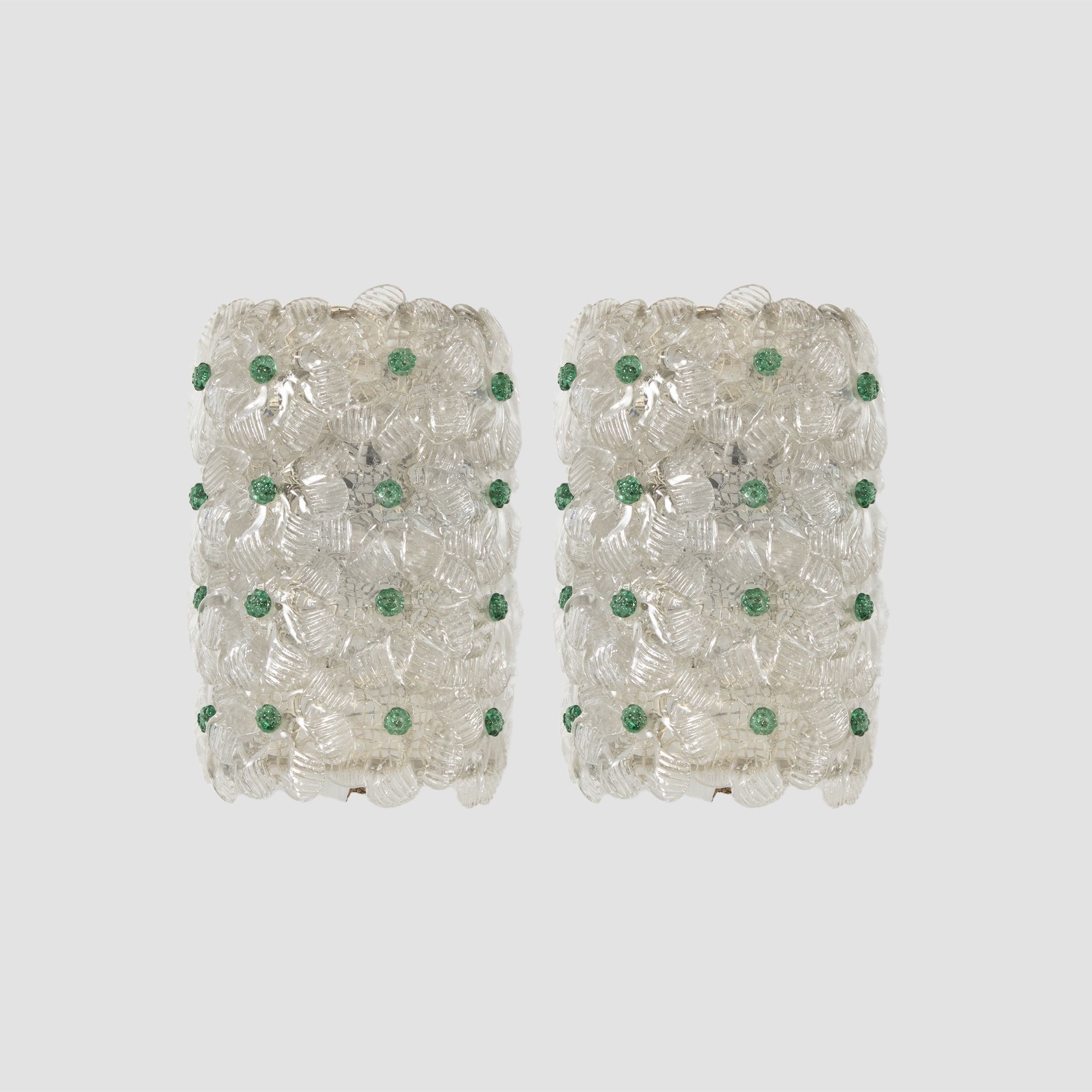 Murano, anni 50-60 coppia di lampade da parete con fiori in vetro soffiato trasparente e colorato, supporto in metallo
