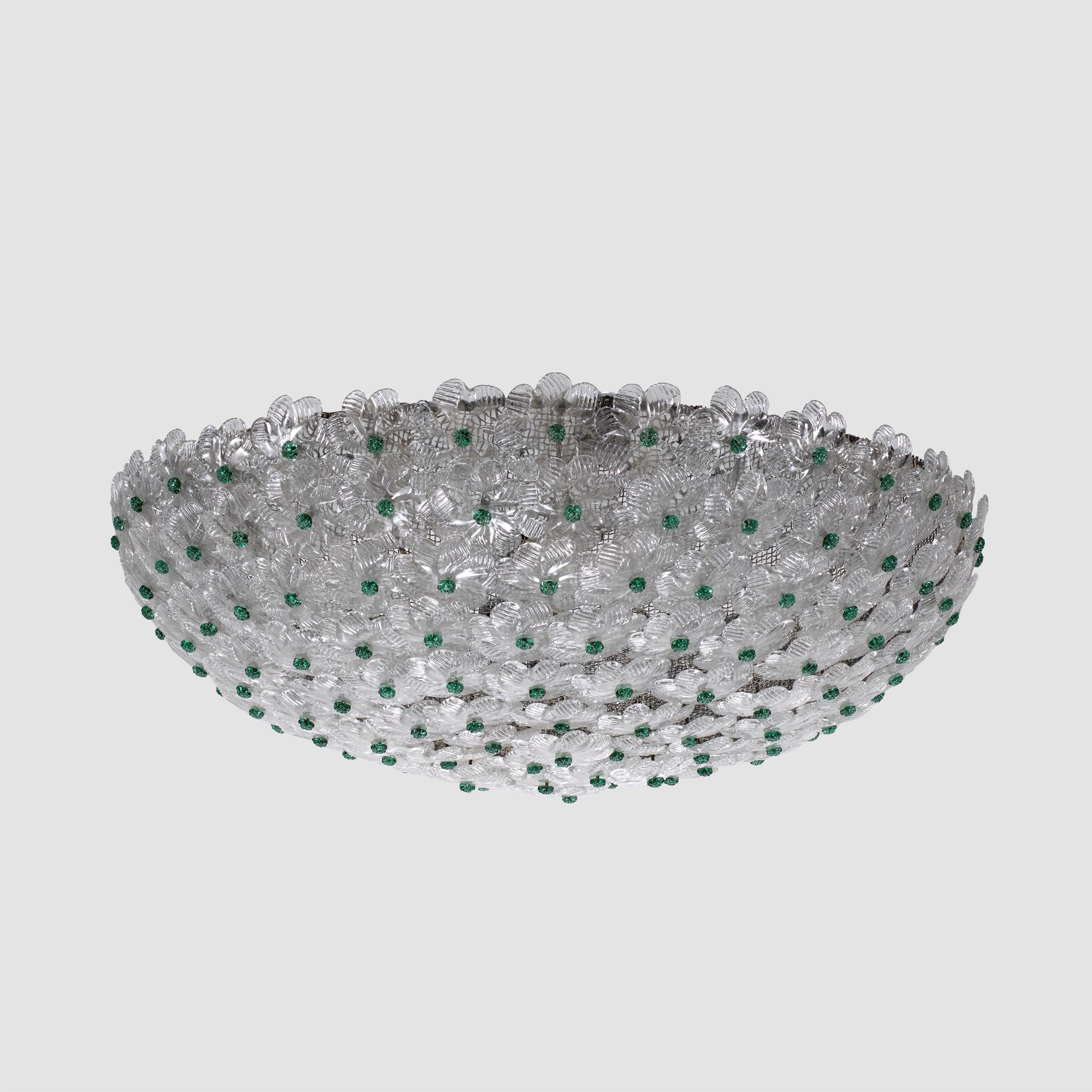 Murano, anni 50-60 lampada da soffitto con fiori in vetro soffiato trasparente e colorato, supporto in metallo