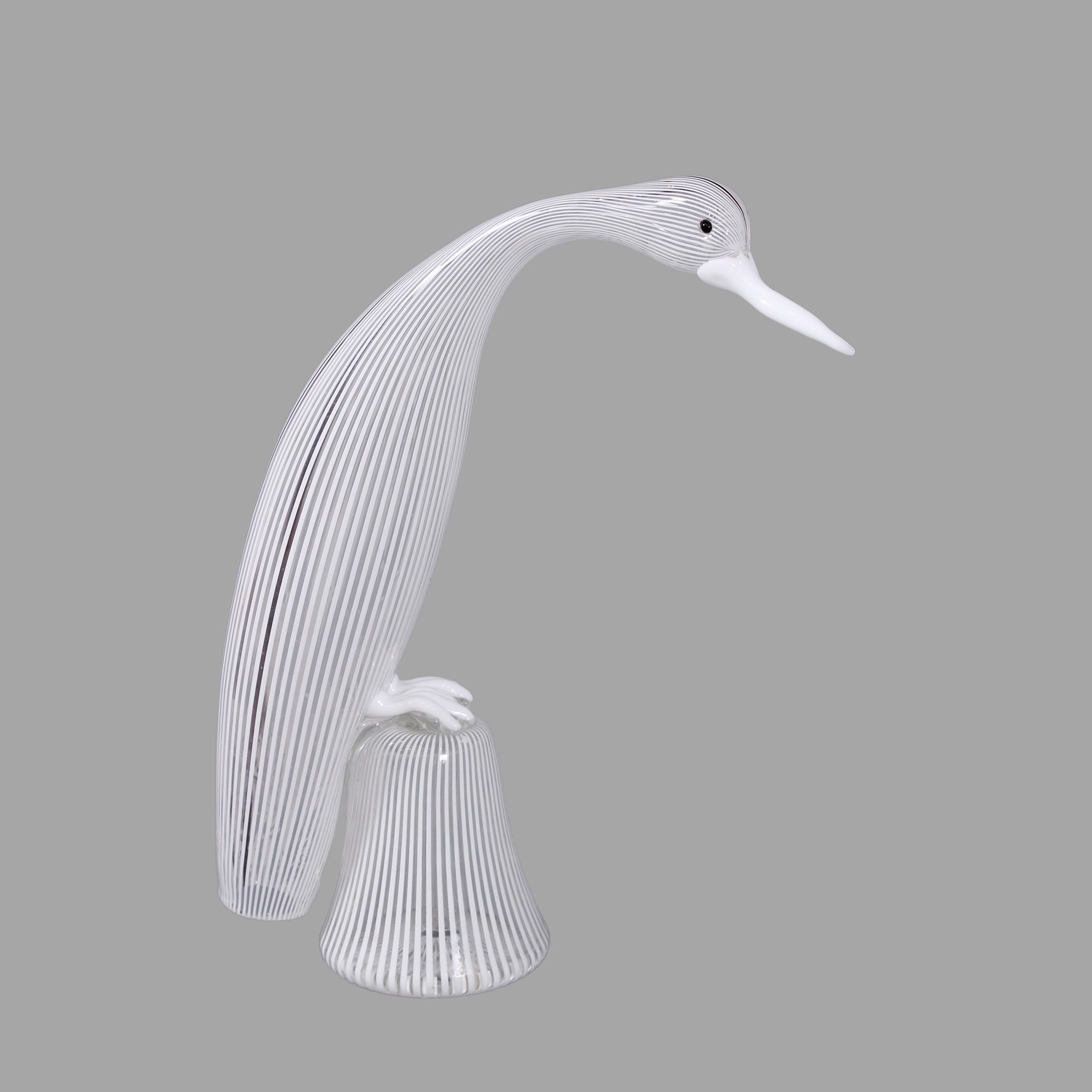h. 32 cm. Murano, anni 50 uccello acquatico mod. 2779 in vetro a canne filigranate lattimo con fascia sommersa in ametista scuro sul dorso, firma all'acido, etichetta della produzione. Bibliografia: Catalogo delle Stanza del vetro Fulvio Bianconi alla Venini, pag. 460, 468, 469