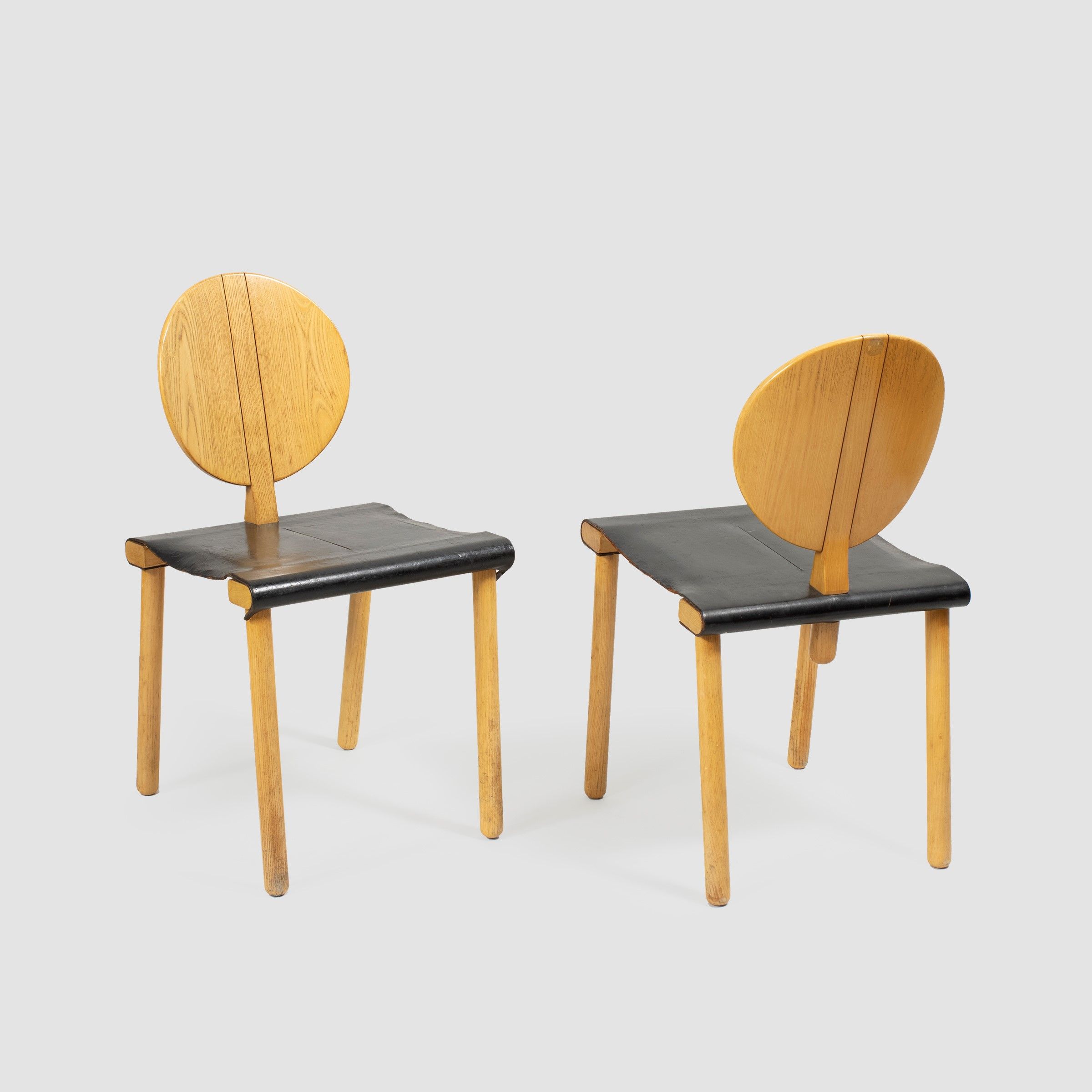 Italia, anni 70 quattro sedie mod. Fiona in legno e pelle, marchio della produzione, lievi usure