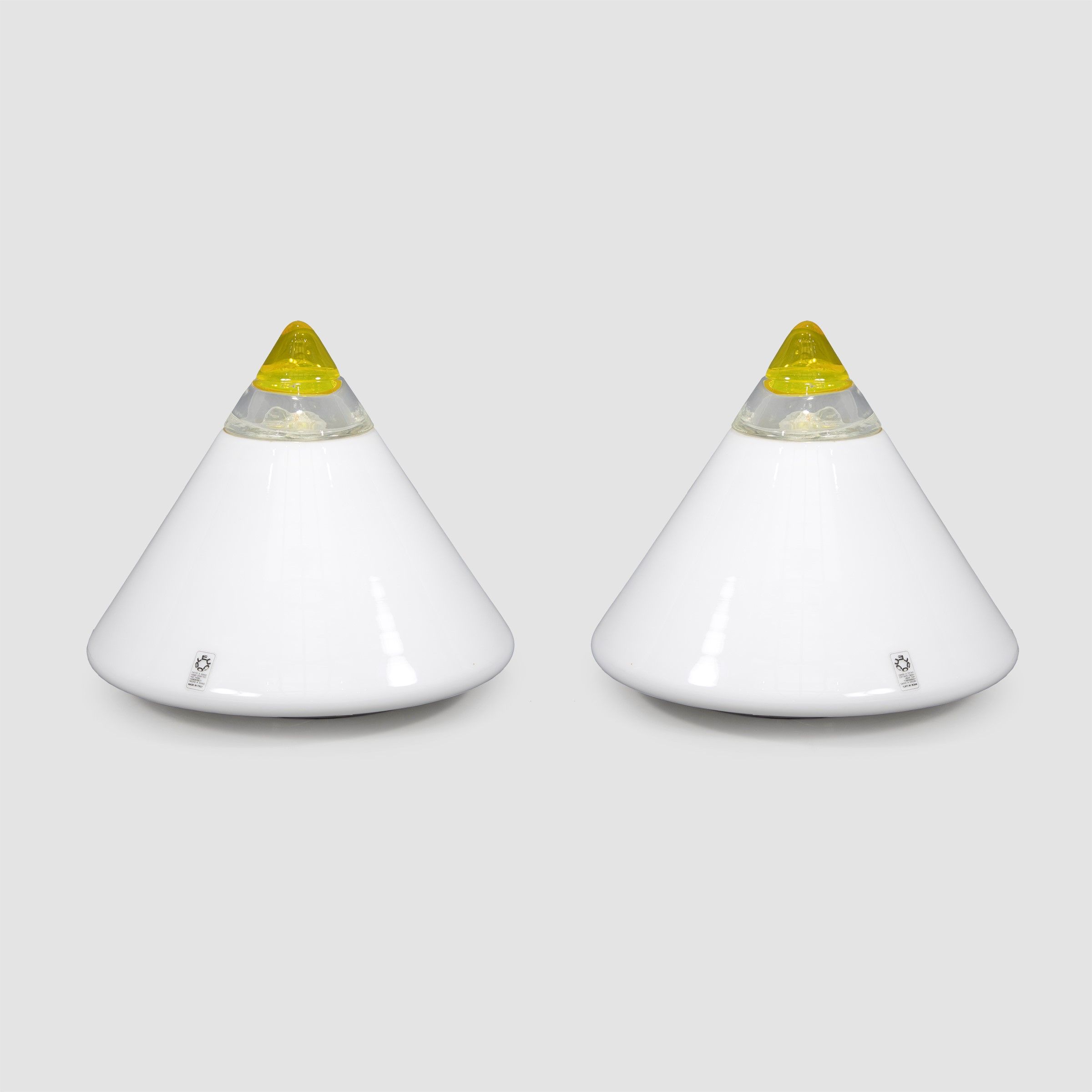 Italia, anni 70 coppia di lampade da tavolo mod. Rio in vetro bianco, colorato, trasparente e metallo, etichetta della produzione