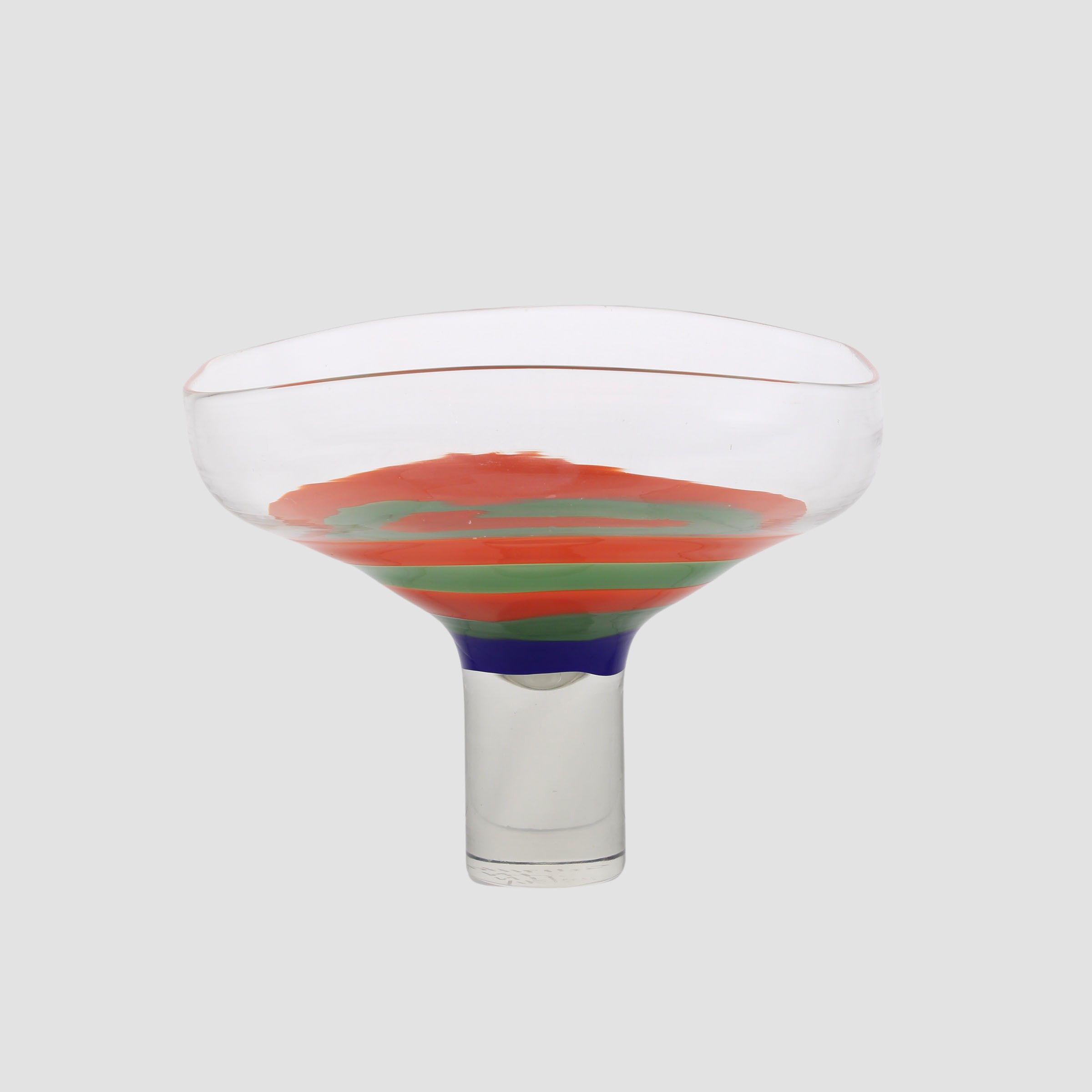 18x21,5x17,5 cm. Murano, 1965 coppa in vetro trasparente con decoro a fasce policrome concentriche e piede massiccio, firma a punta. Bibliografia: F. Deboni, I vetri Venini Catalogo 1921/2007, Umberto Allemandi & C., Torino, 2007, Volume II, fig. 247