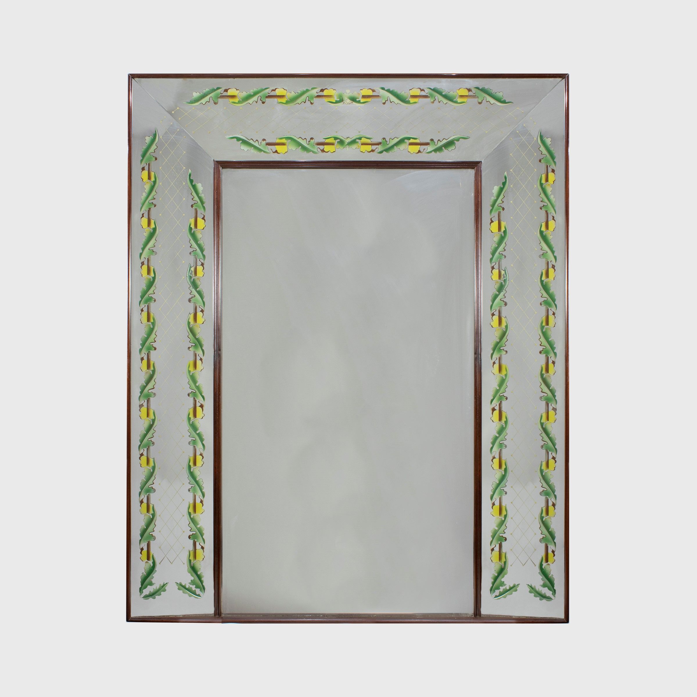 Italia, anni 40 grande specchio elettrificato in legno e vetro specchiato decorato