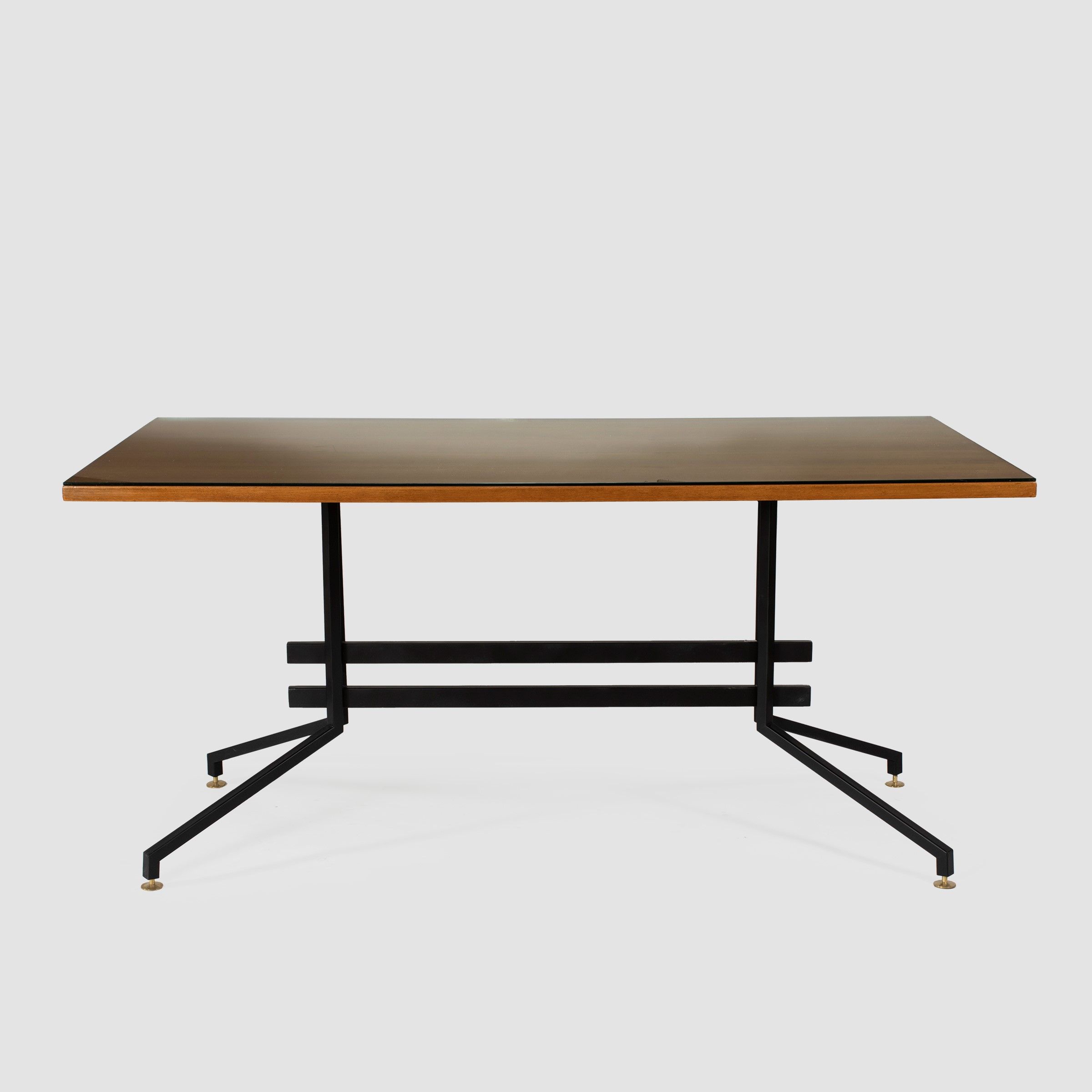anni 60 tavolo in legno, vetro trasparente, metallo verniciato ed ottone