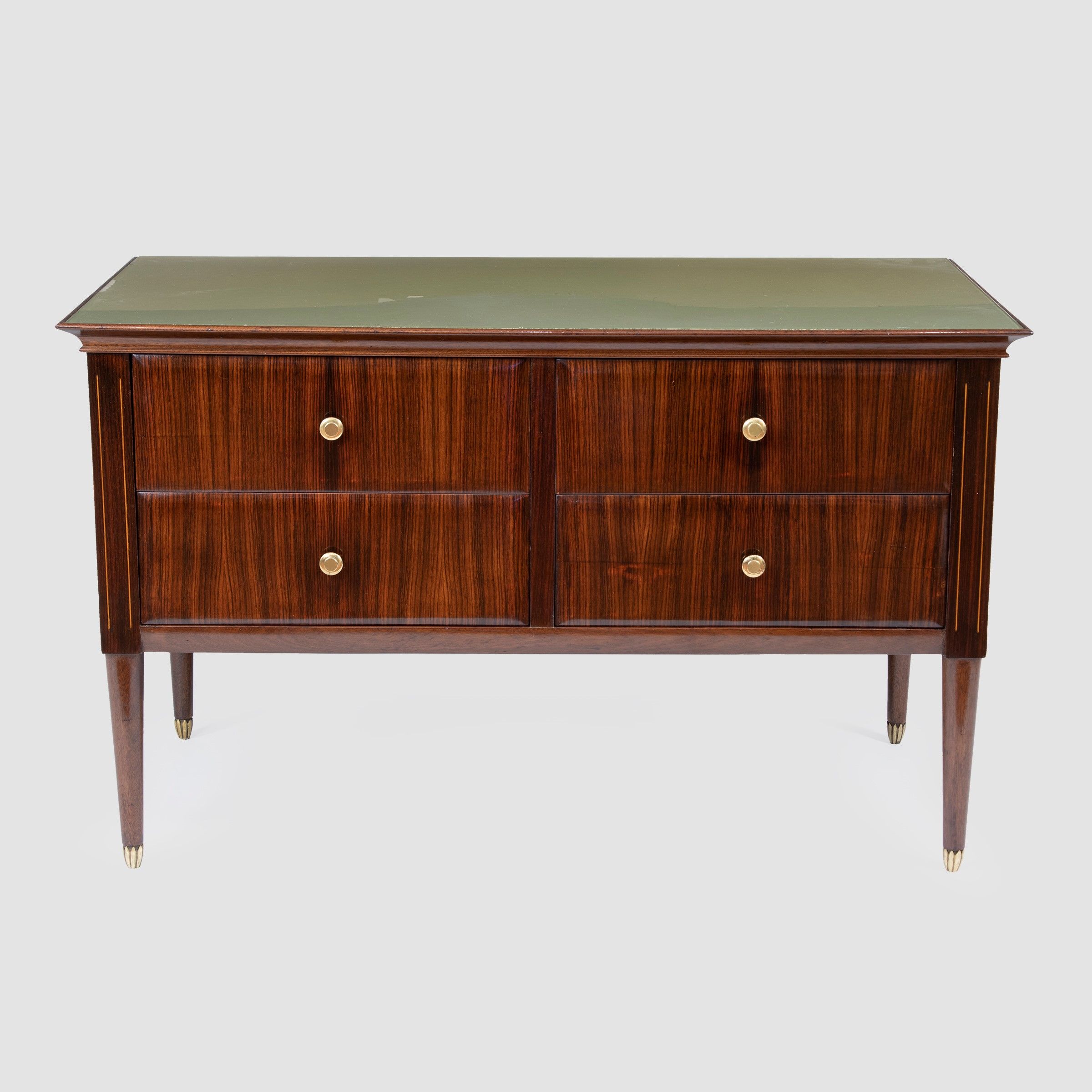 anni 50-60 cassettiera in legno, ottone e vetro retroverniciato, lievi usure