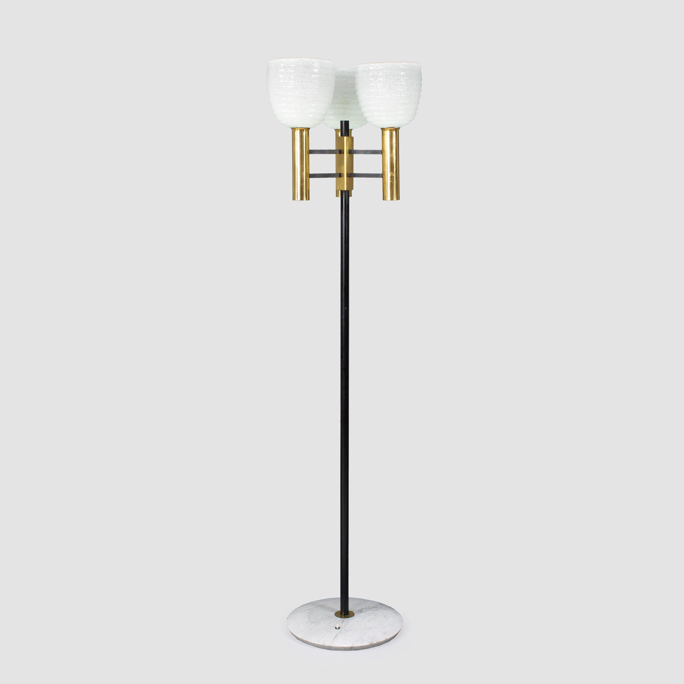 anni 50 lampada da terra in ottone, metallo verniciato, vetro a bollicine, base in marmo, lievi difetti