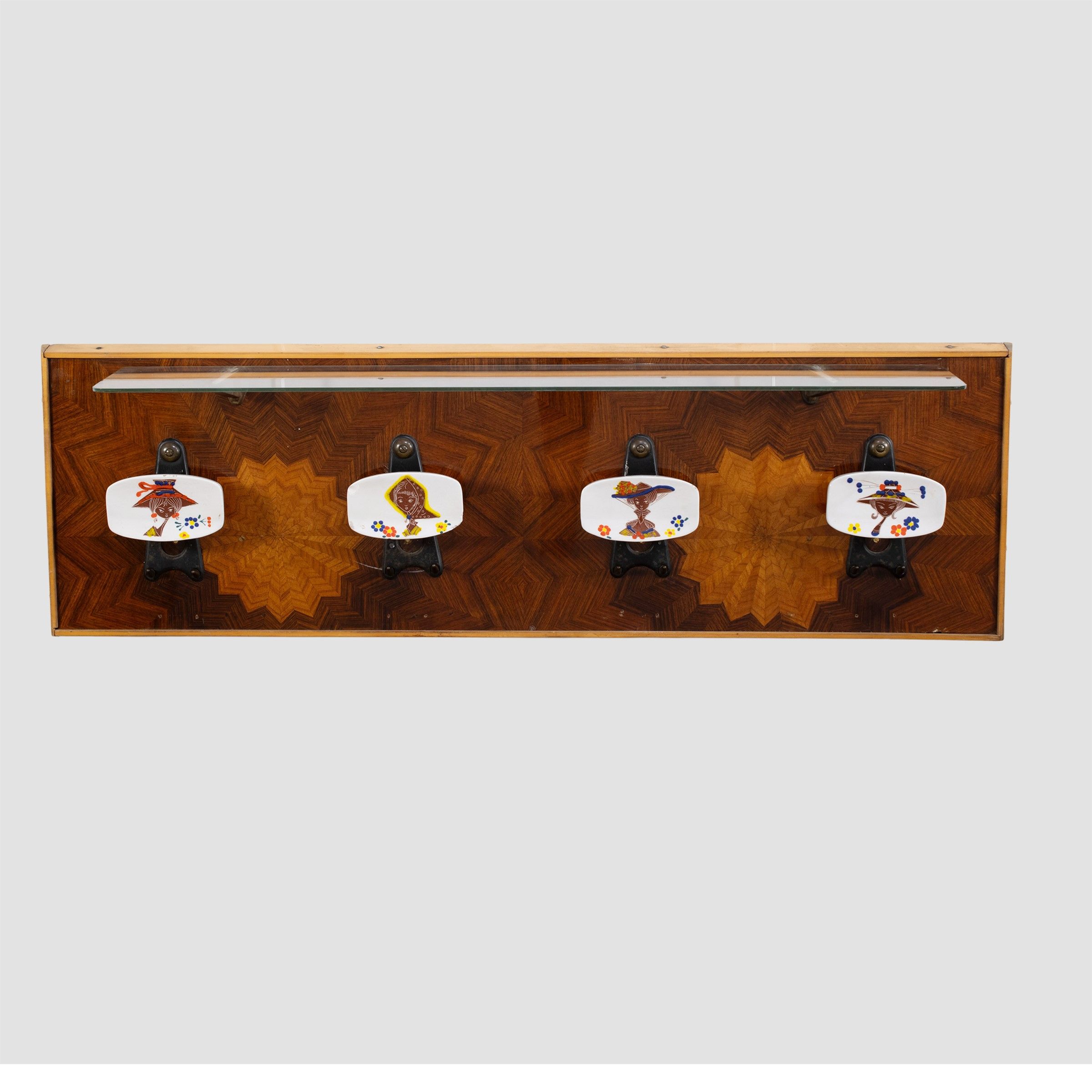 anni 50 appendiabiti con cappelliera in legno, ottone, metallo verniciato, ceramica policroma e vetro trasparente, difetti