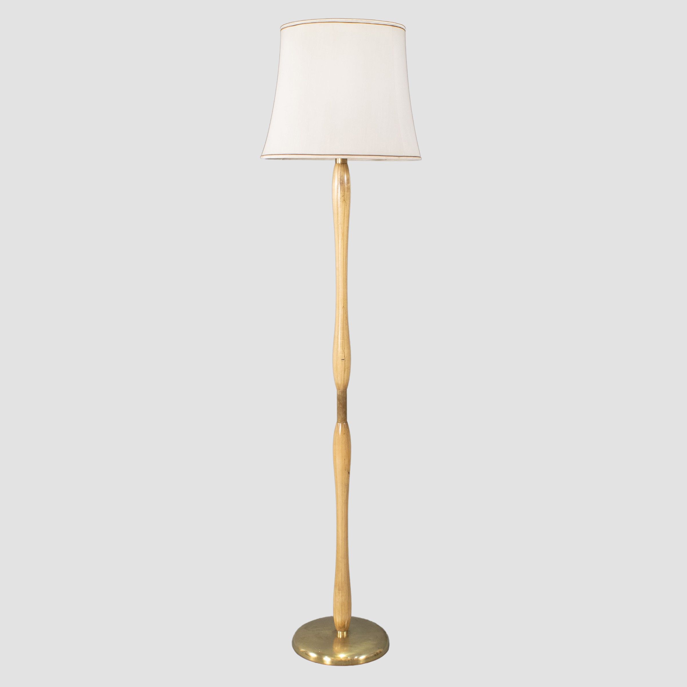 anni 50-60 lampada da terra in legno ed ottone, completa di paralume