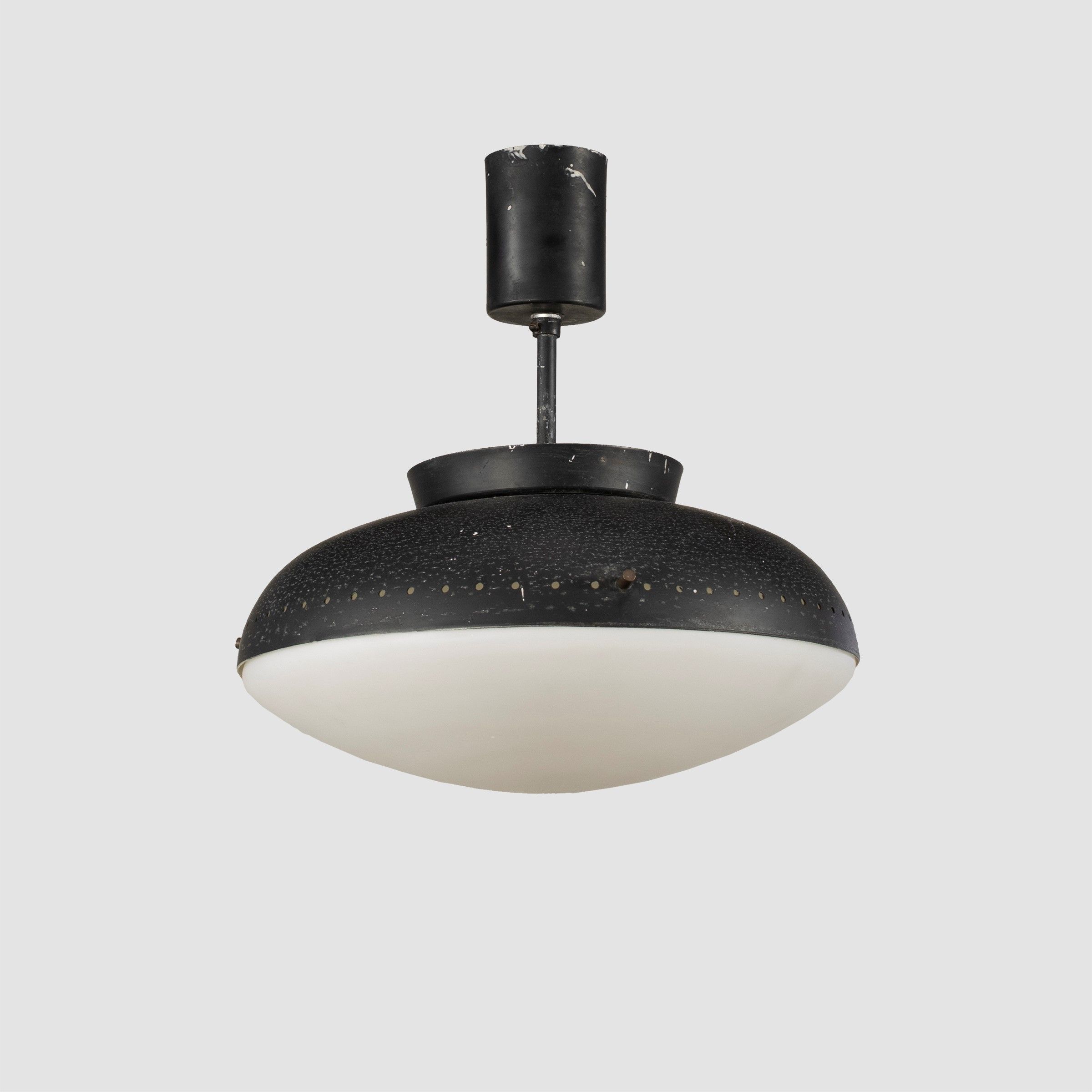 anni 50-60 lampada a sospensione in ottone, metallo verniciato e vetro satinato, usure
