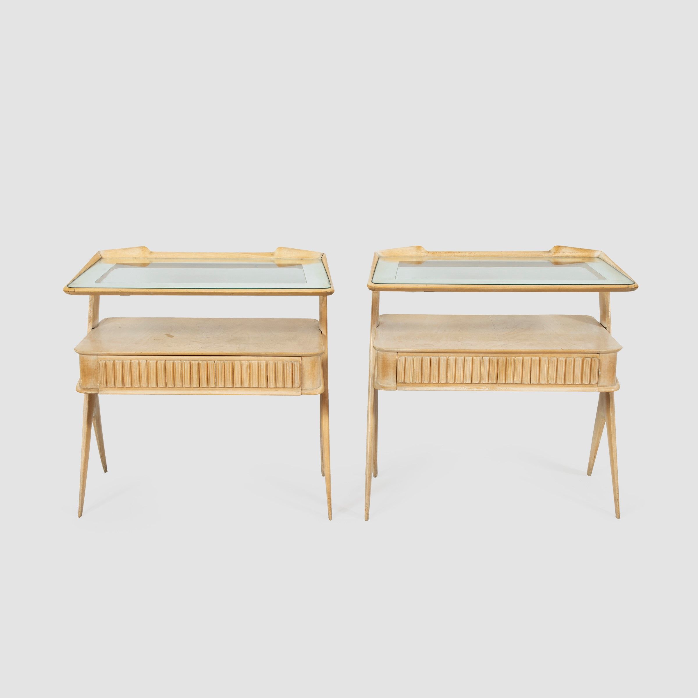 anni 50 coppia di comodini in legno, vetro specchiato e trasparente, lievi usure