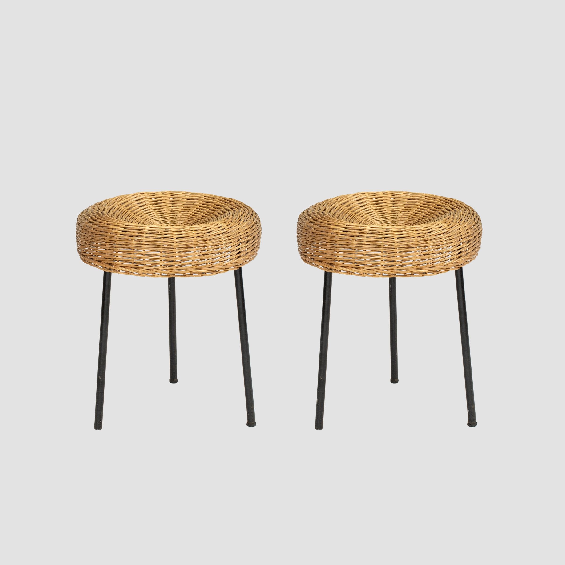anni 60 coppia di sgabelli in rattan e metallo verniciato, lievi usure