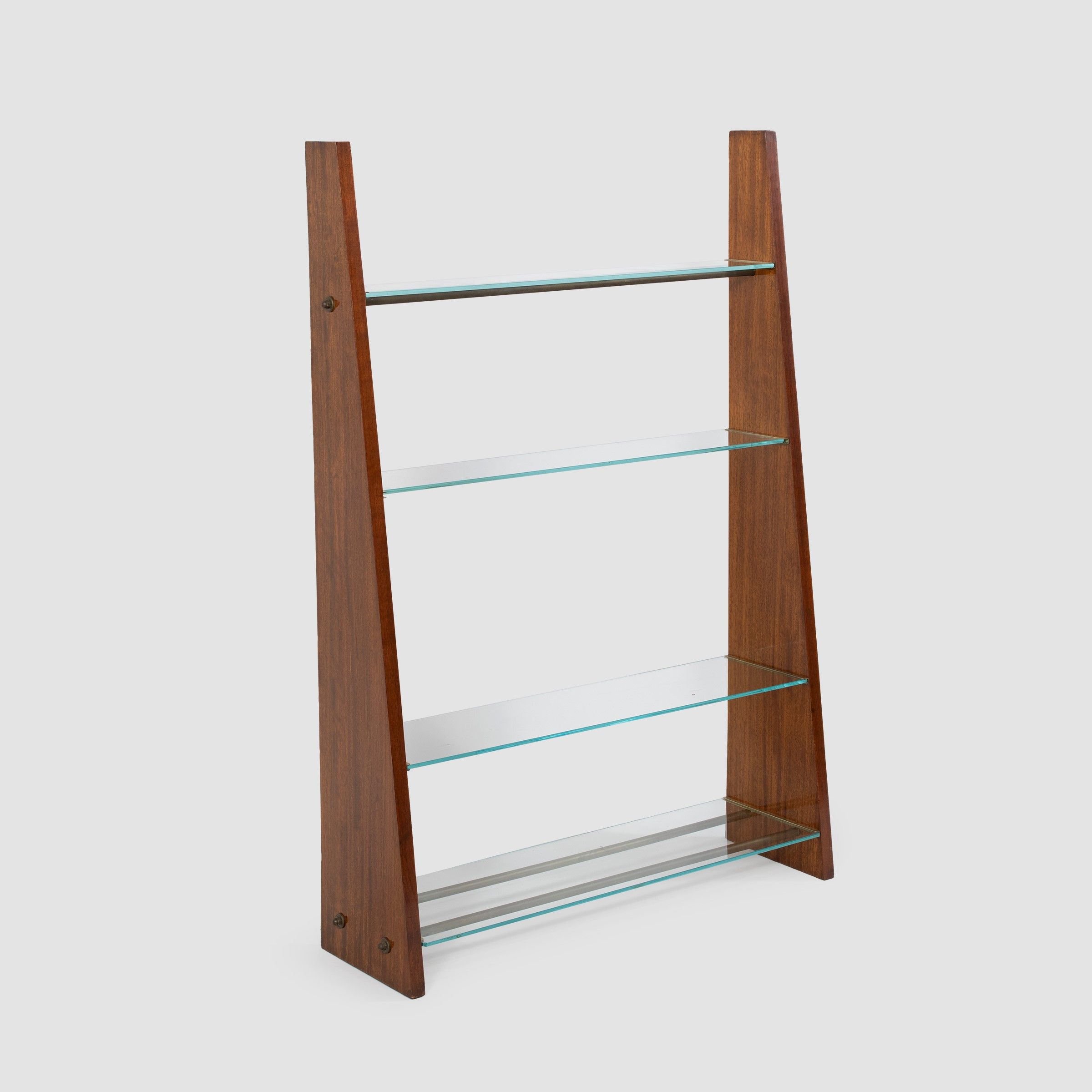anni 50 libreria in legno, vetro trasparente e ottone, lievi difetti
