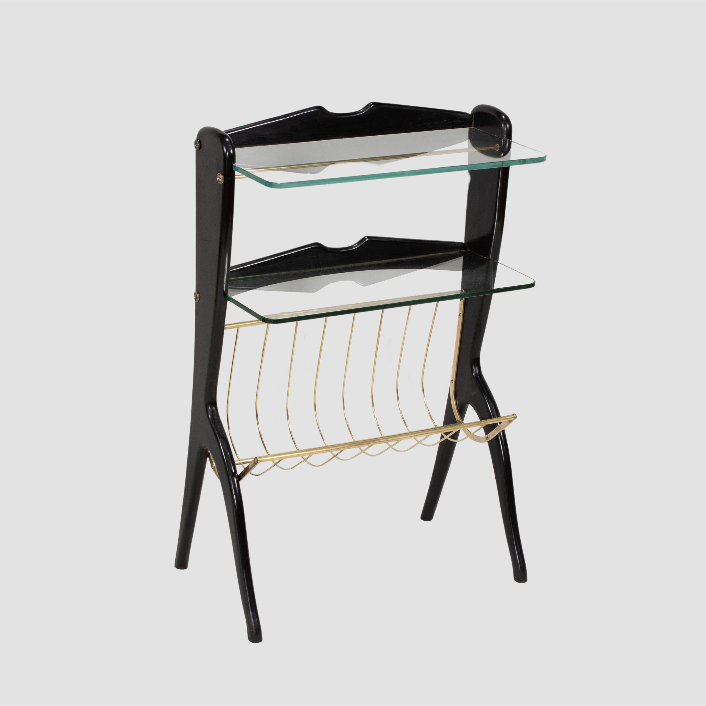 anni 50 portariviste in legno laccato, ottone e vetro trasparente