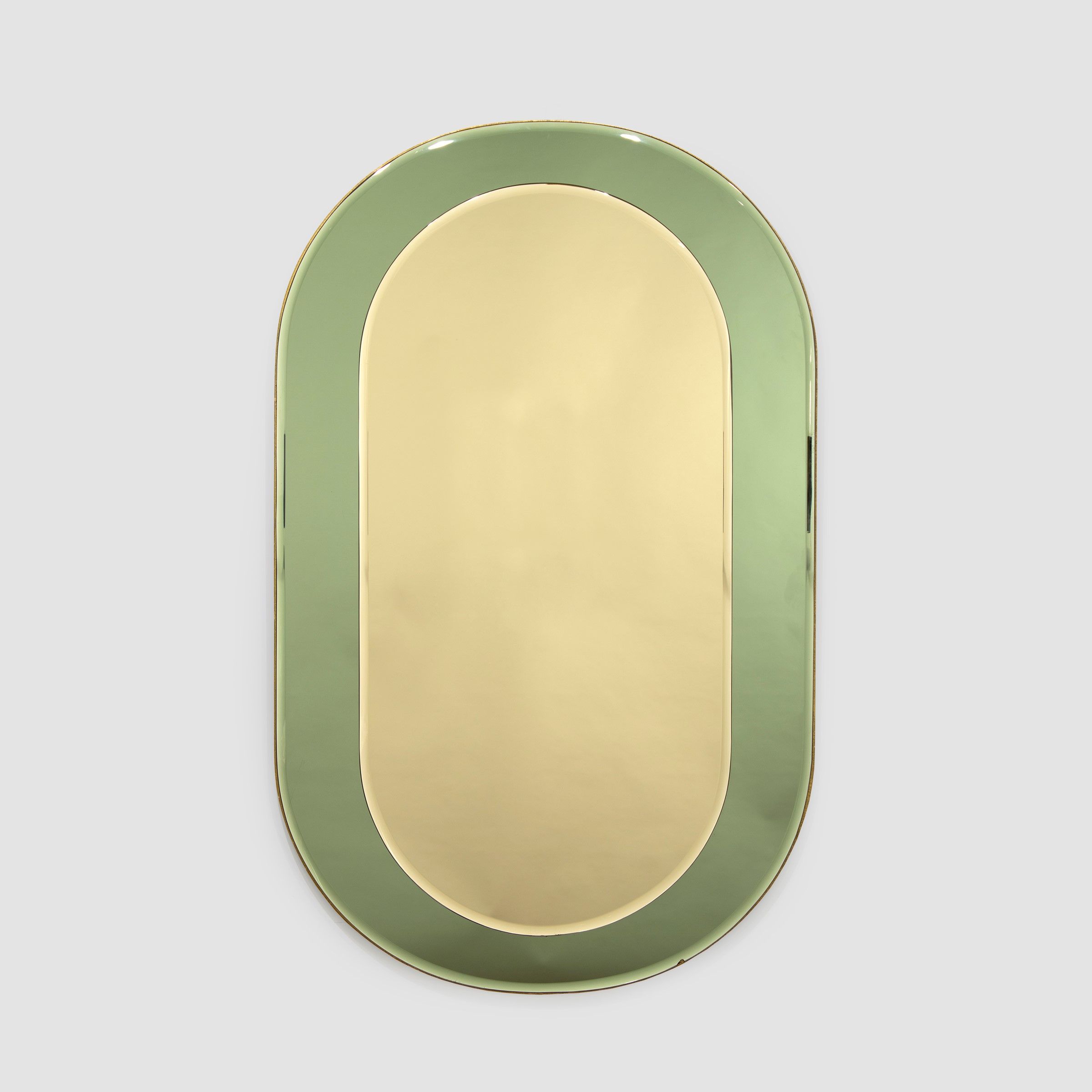 anni 70 specchio in legno dipinto, vetro colorato e vetro specchiato, lieve difetto