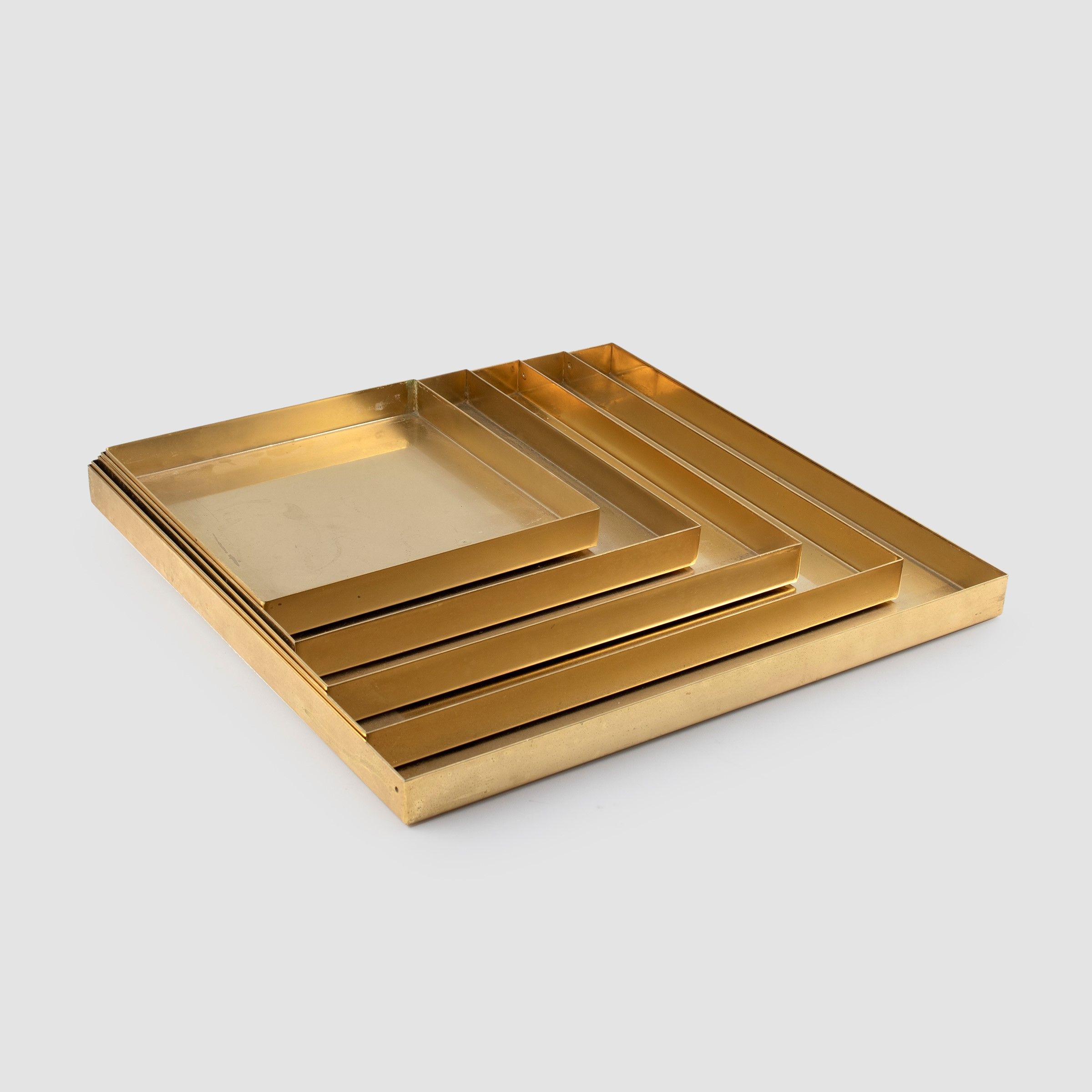 Italia, anni 80 set di vassoi di forma squadrata in ottone, misure diverse, lievi usure