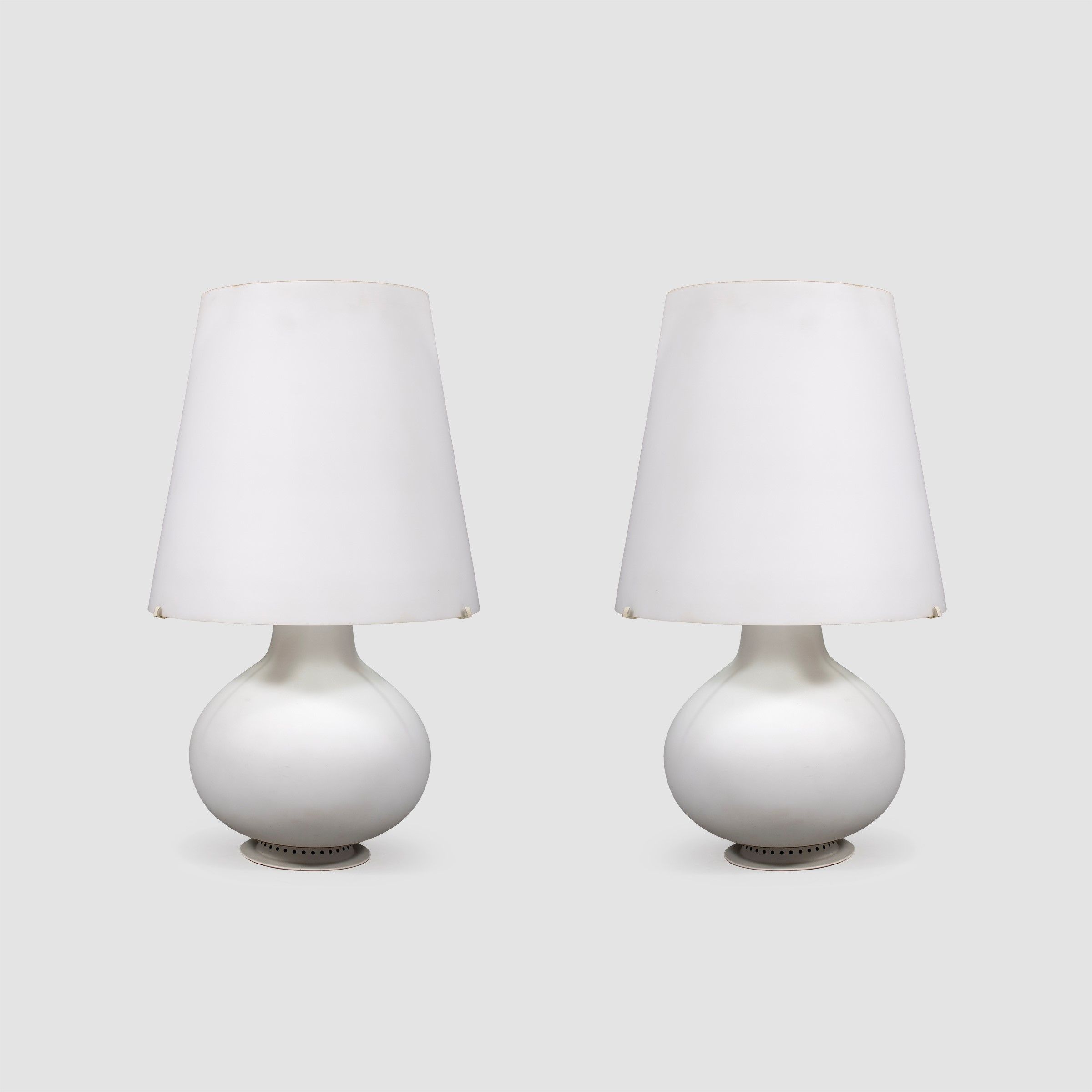 Italia, anni 60-70 coppia di lampade da tavolo mod. 1853 in vetro satinato e metallo laccato, marchio della produzione