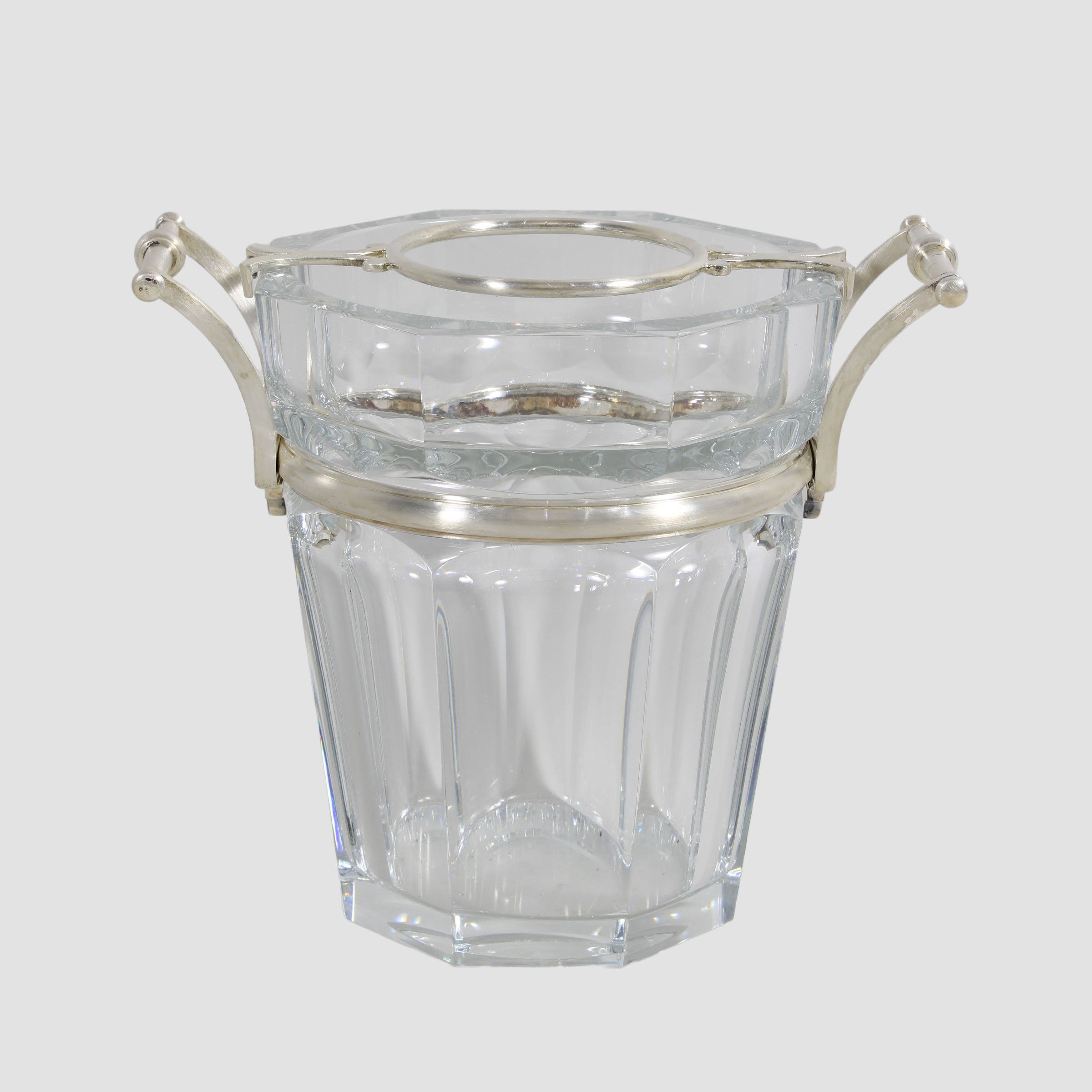 Francia, anni 80-90 secchiello porta champagne collezione Harcourt in cristallo trasparente e metallo argentato, firma e marchio della produzione