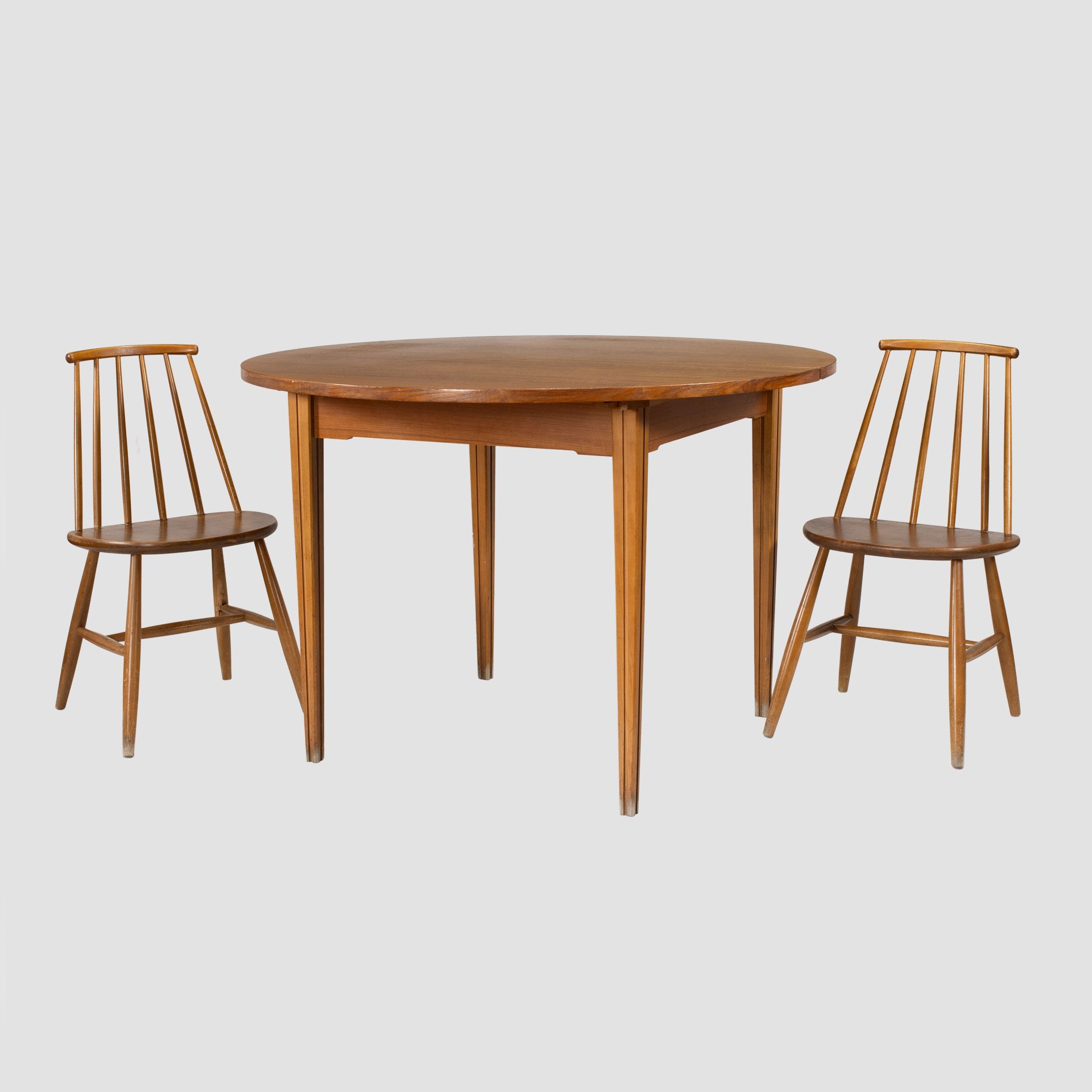 Svezia, anni 60 tavolo circolare allungabile con quattro sedie in legno, marchio della produzione