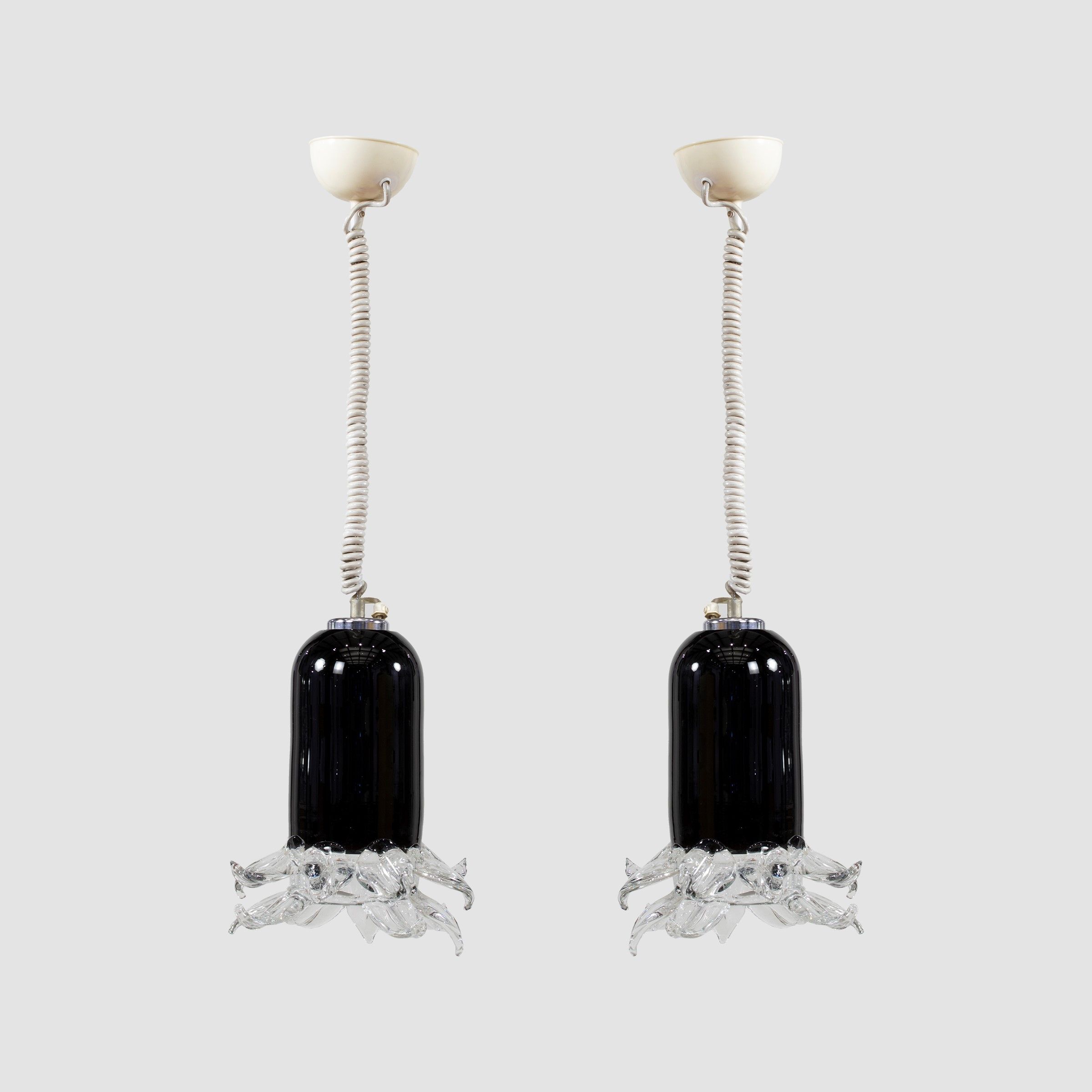 Murano, anni 70 coppia di lampade a sospensione in metallo, vetro trasparente e colorato, marchio della produzione, mancanze
