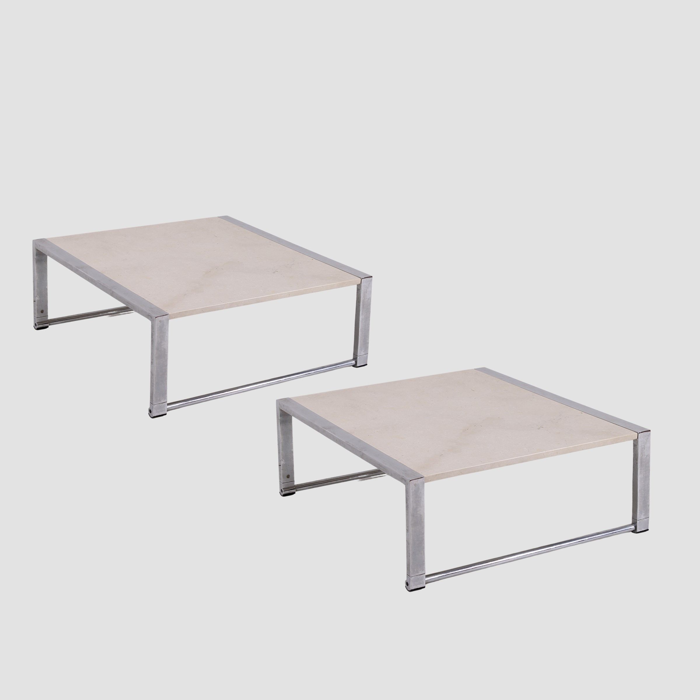 Italia, anni 70 coppia di tavolini in acciaio e marmo, etichetta della produzione