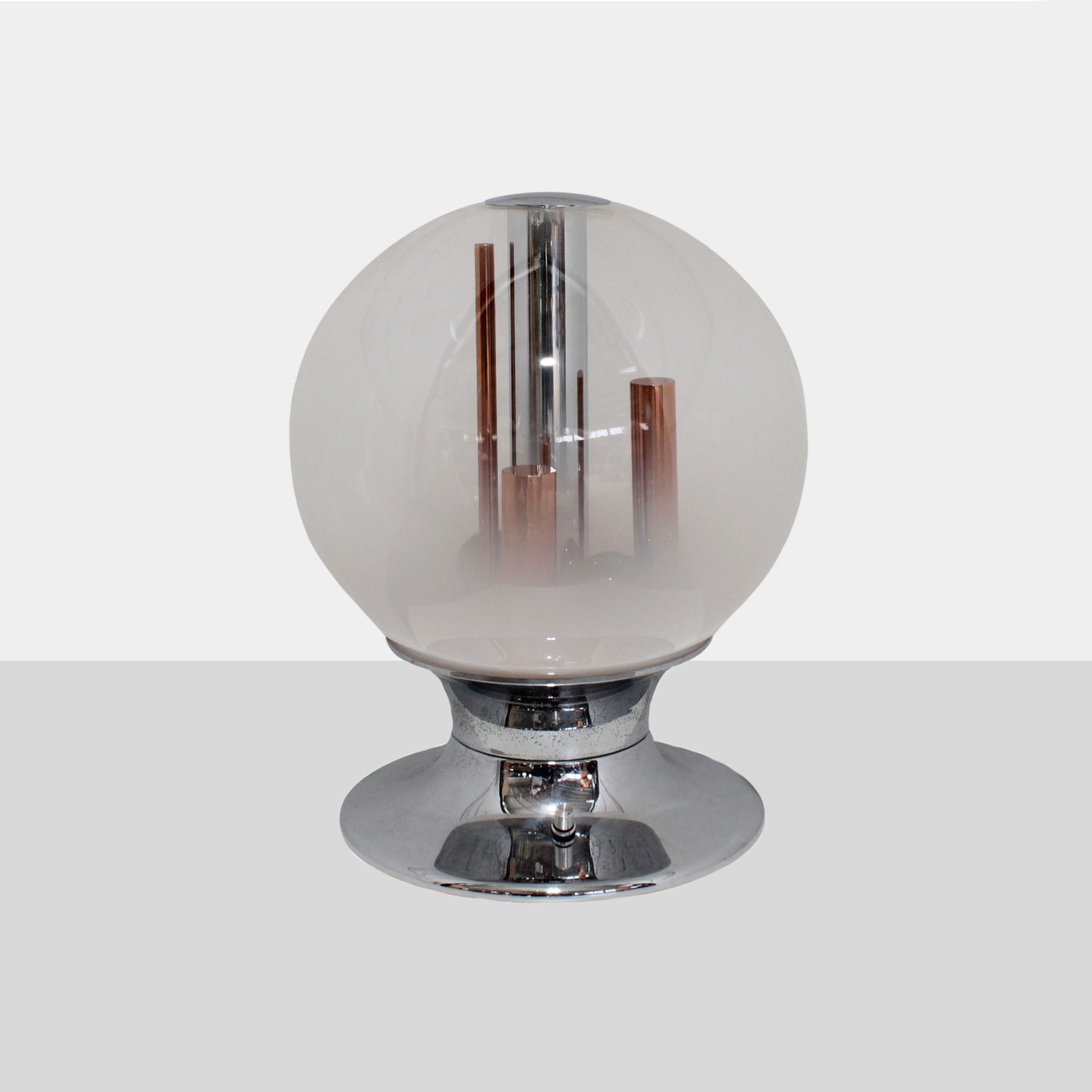 Italia, anni 70 lampada da tavolo in metallo cromato, vetro trasparente e vetro colorato