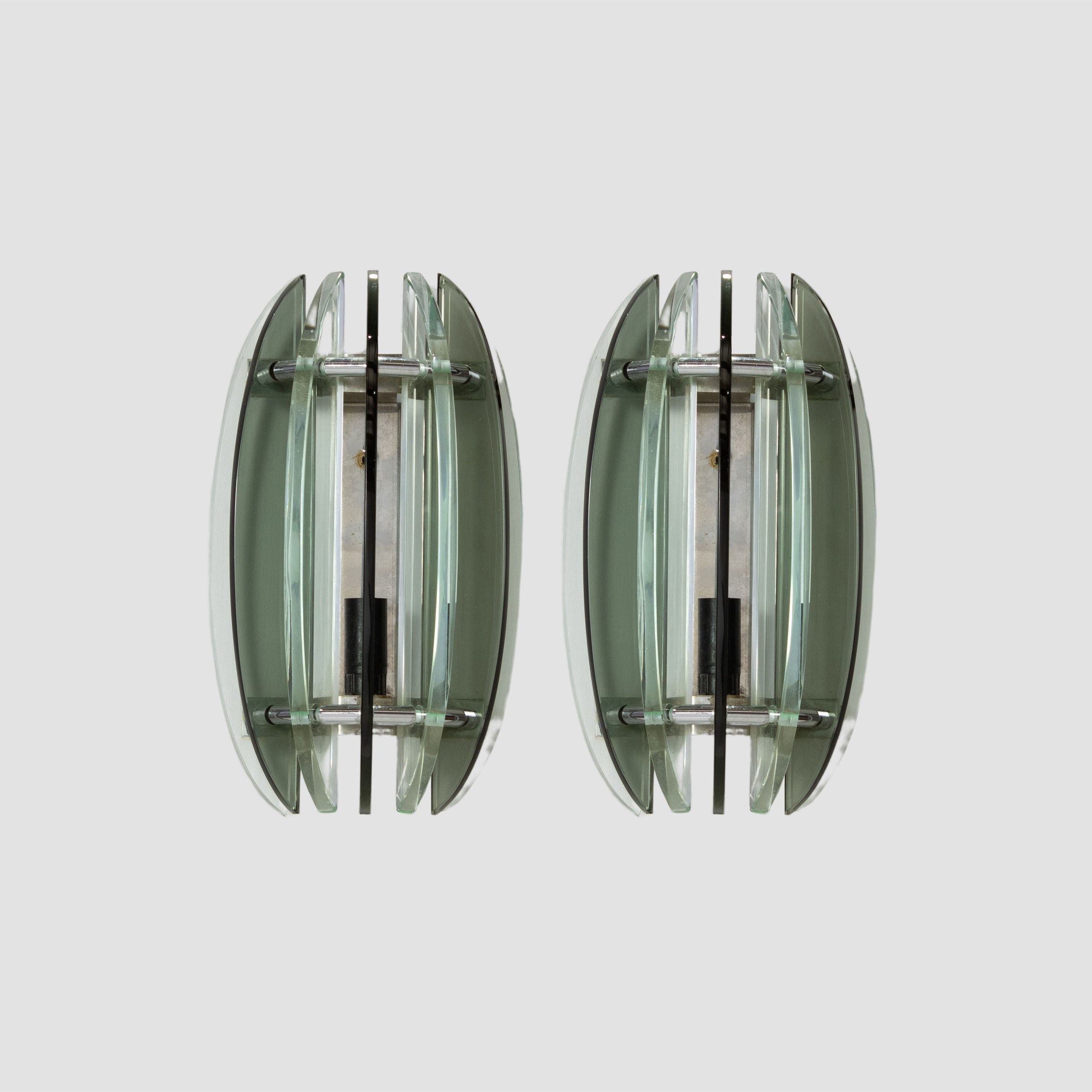 Italia, anni 60 coppia di lampade da parete in metallo cromato, vetro trasparente e vetro colorato, etichetta della produzione