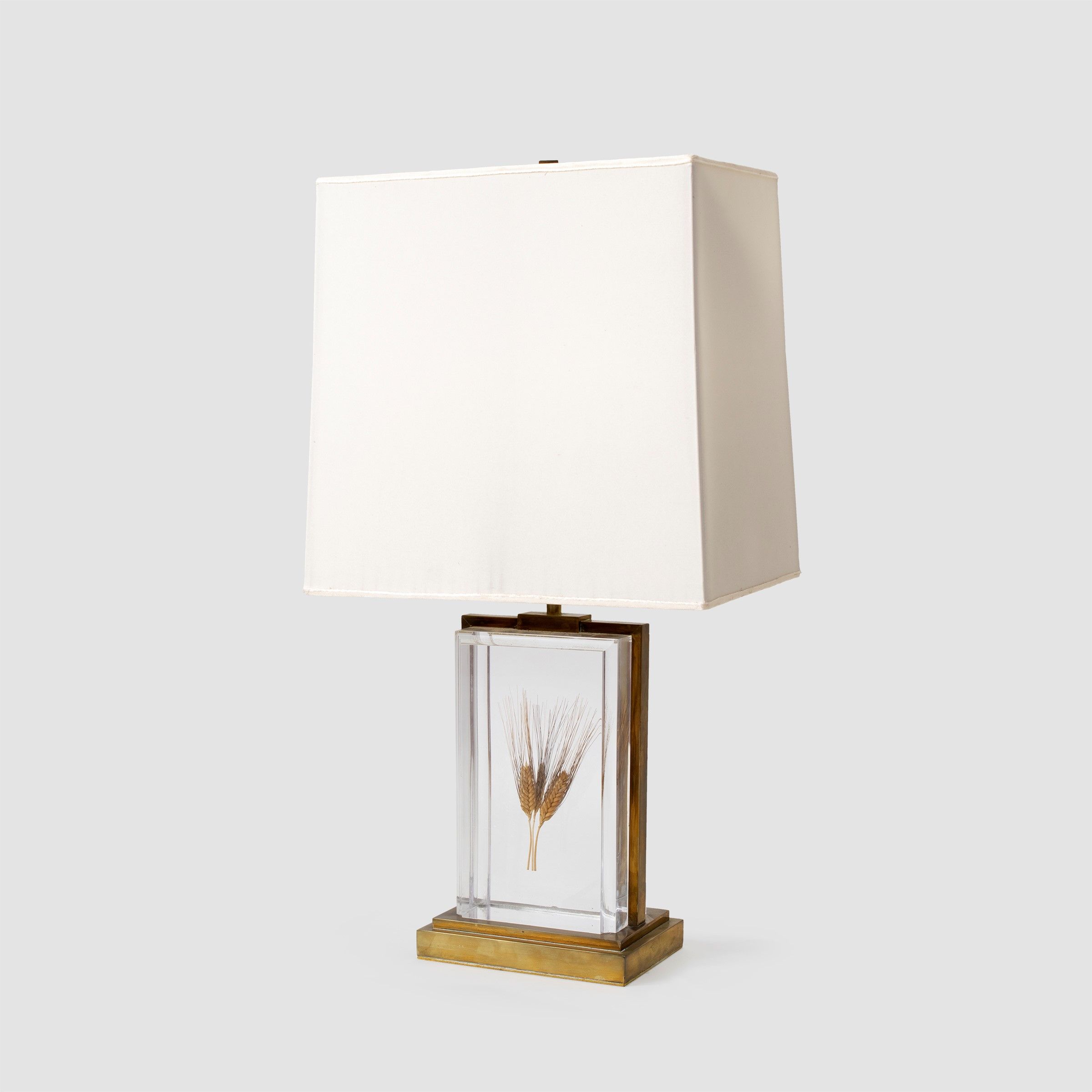 Italia, anni 60 lampada da tavolo in ottone e perspex, completa di paralume