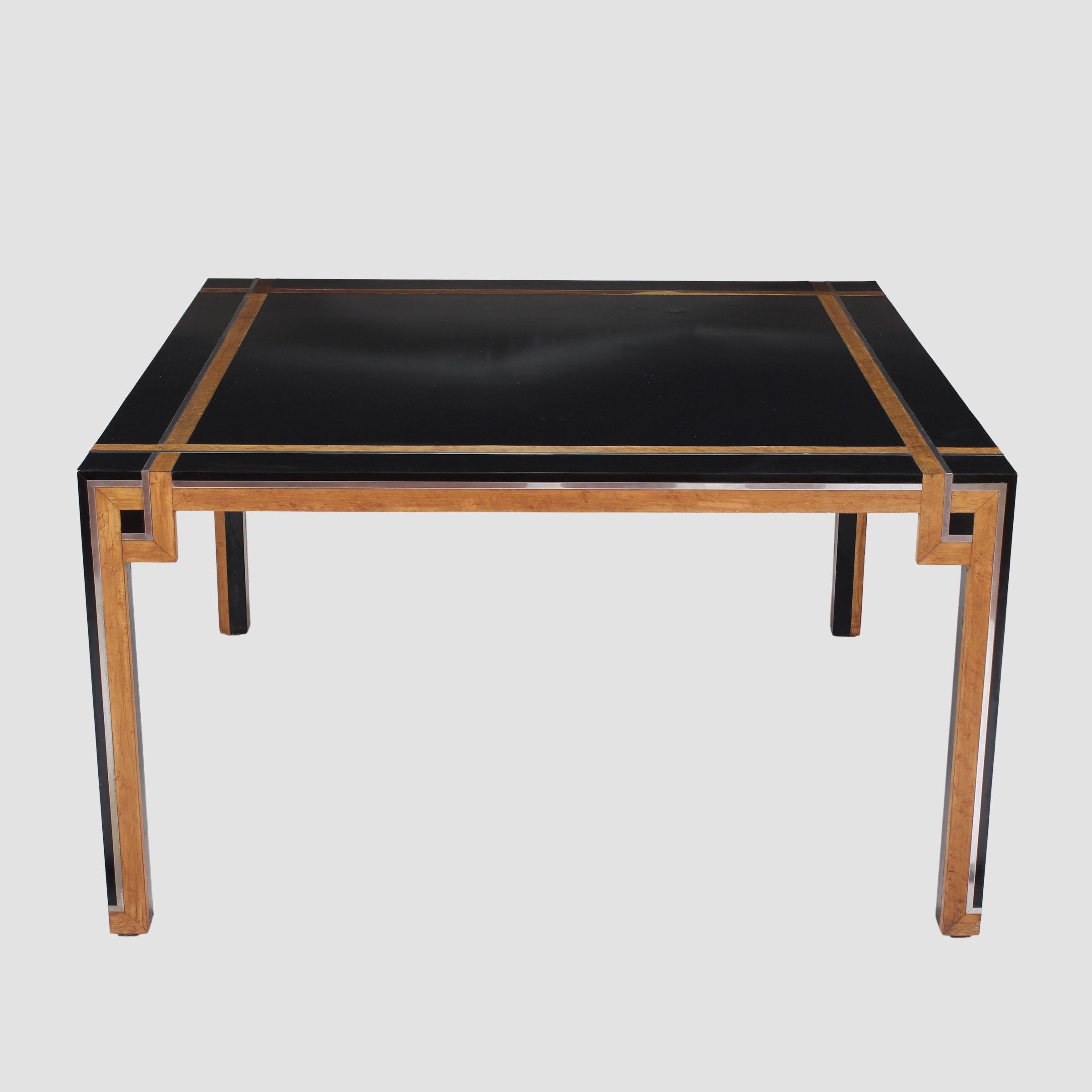 Italia, anni 70 tavolo quadrato in legno dipinto, metallo e radica, lievi usure