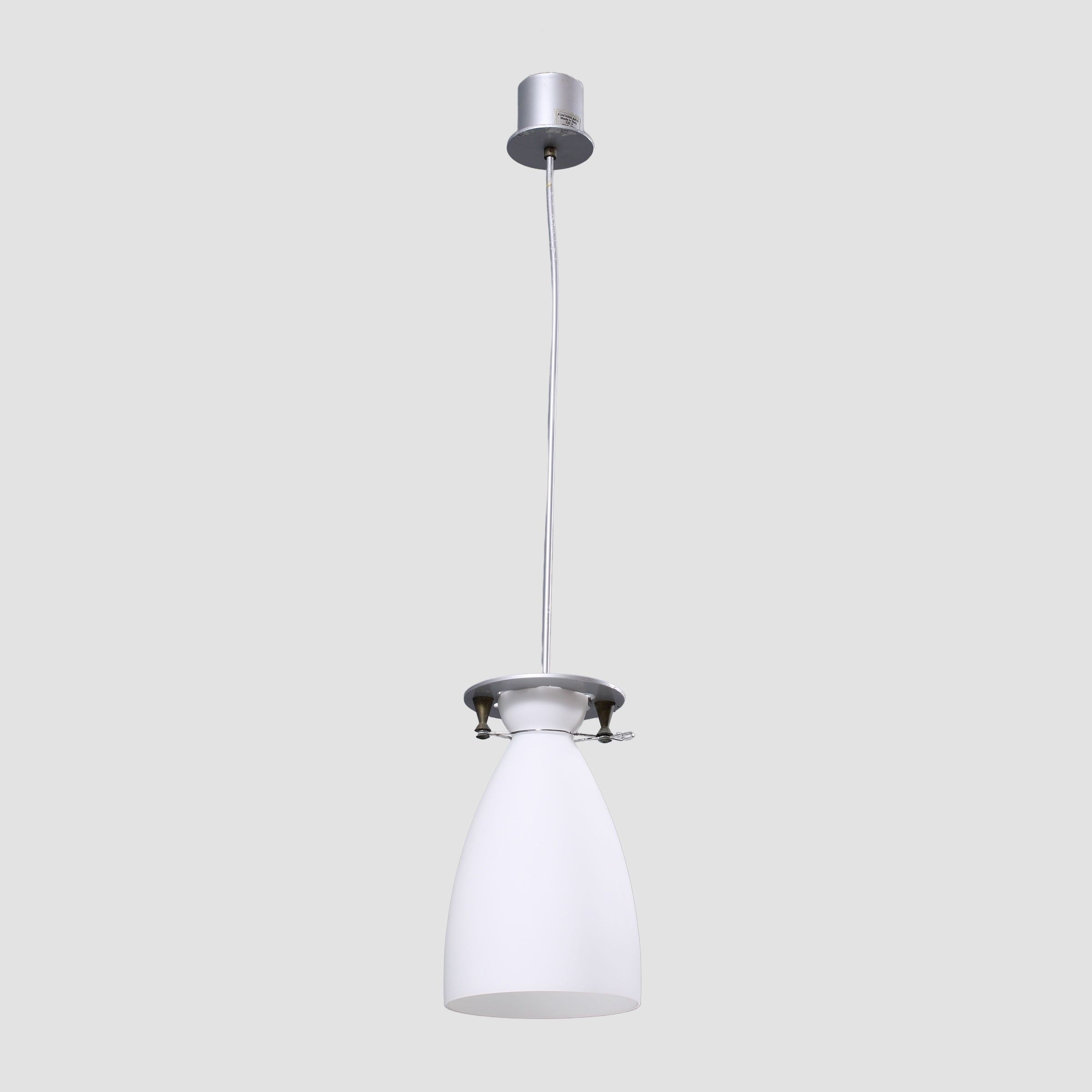 Italia, 1989 lampada a sospensione mod. Franceschina in metallo verniciato, alluminio, ottone e diffusore in vetro opalino satinato, etichetta della produzione, usure e difetti.
