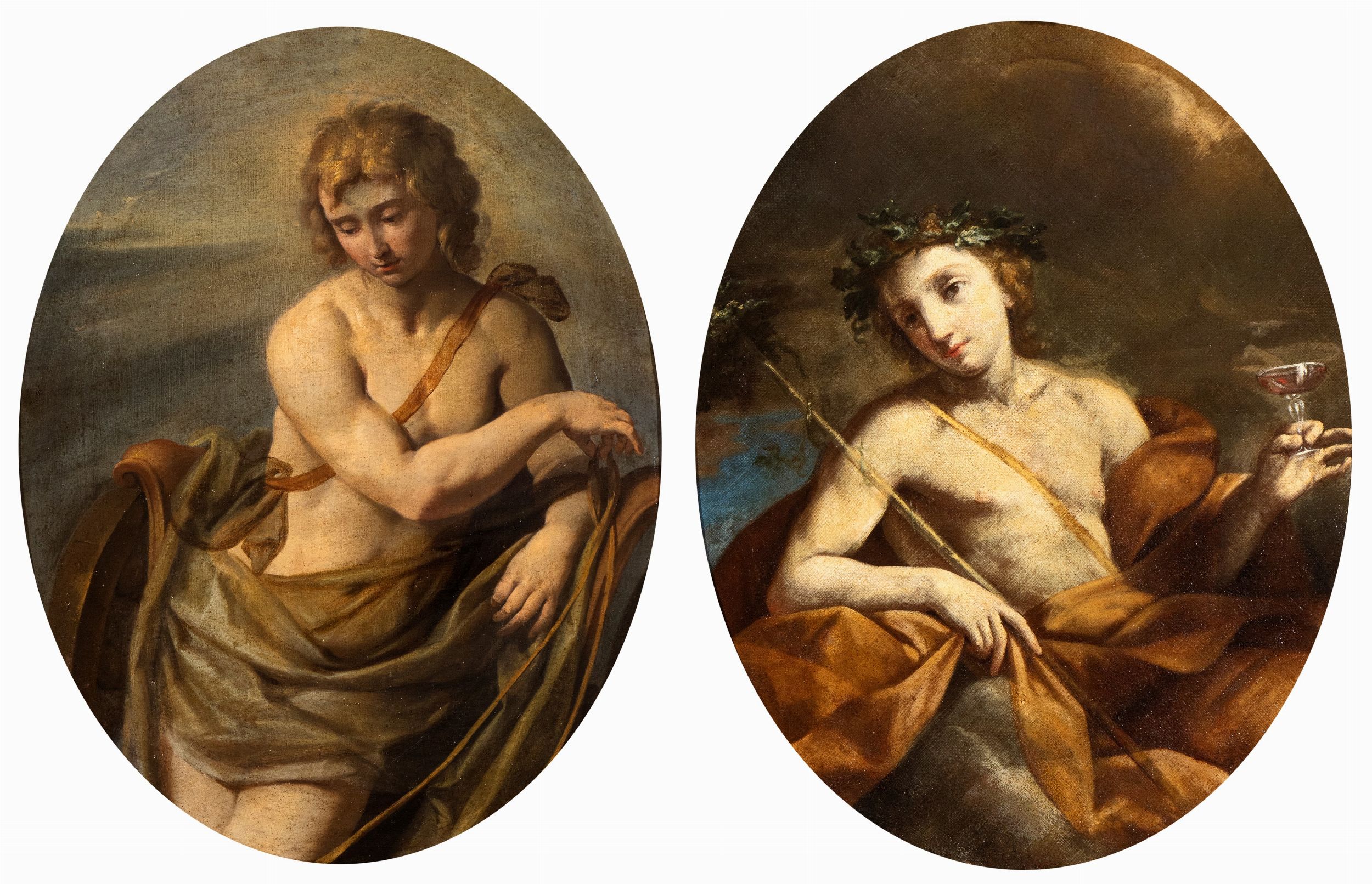 In questa elegante coppia di dipinti ovali a figura singola si individua agevolmente il profondo influsso del classicismo di Guido Reni, conosciuto e studiato di prima mano. L'atelier reniano fu, del resto, una fucina impressionante di talenti fra i più luminosi della pittura italiana del Seicento, se pensiamo che da essa scaturirono Cantarini e Cagnacci, ma anche Desubleo, Cittadini, Gessi, Torri e i Sirani: e proprio a Sirani senior si propone di avvicinare le nostre due tele. Ne sono indizi rilevanti il tratto grafico fluido e sicuro, la vaghezza aggraziata e malinconica delle espressioni e la raffinata paletta cromatica, giocata su poche gamme dal marrone al grigio, su cui risalta il chiarore degli incarnati dei busti e dei volti. Confronti interessanti possono essere suggeriti, tra gli altri, con opere di Giovanni Andrea Sirani quali la Sibilla del Kunsthistorisches Museum di Vienna, il Bacco e Arianna nelle due versioni nella Galleria Corsi di Firenze e in collezione privata, e l'Apollo proposto nella vendita Pandolfini del 26 novembre 2019 (l. 5).