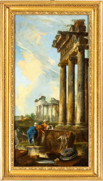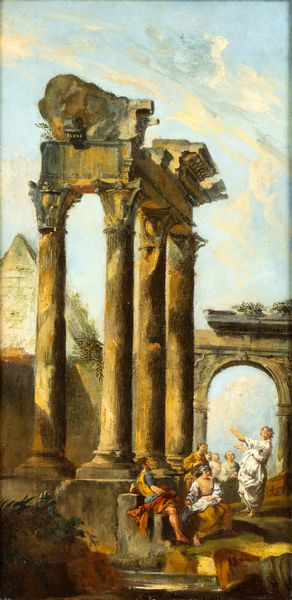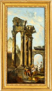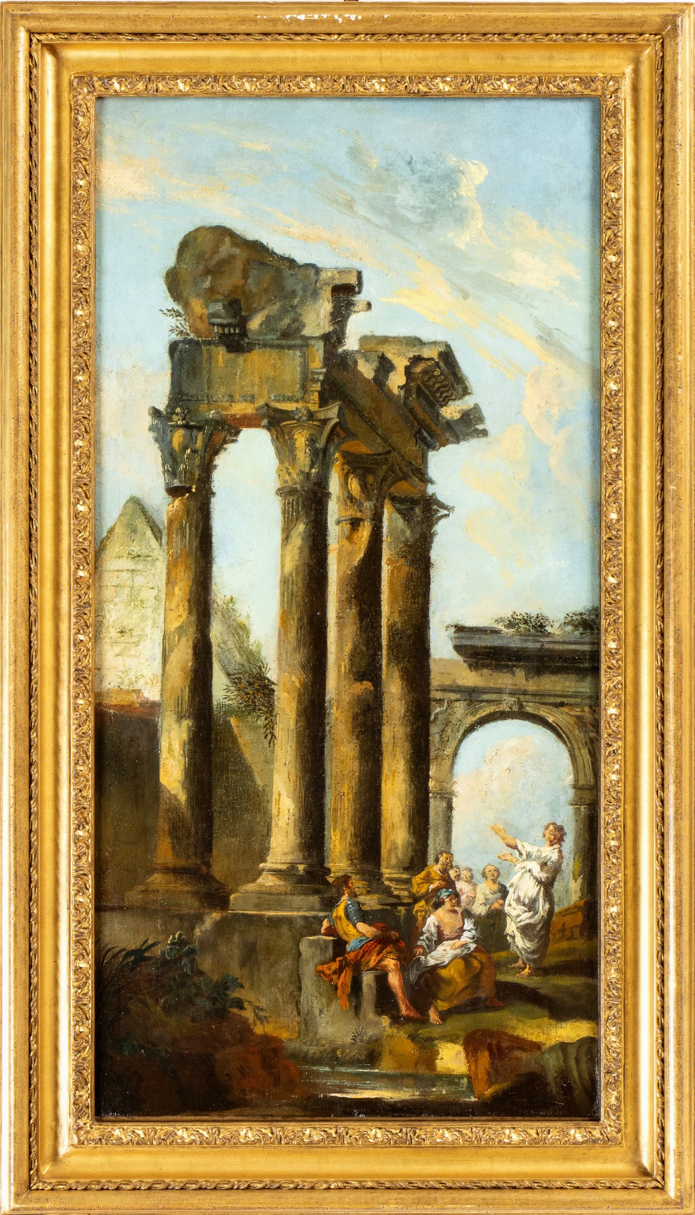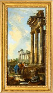 Nel catalogo del Panini sono numerose le repliche pienamente autografe di soggetti come lo Interno del Pantheon, o il Campo Vaccino, o di fantasia, quali i suo tipici monumenti dell'antica Roma, reali o raggruppati a capriccio. Tra le più fortunate invenzioni di Panini è costituita dalla coppia di Capricci ovali dell'Accademia di San Luca, comunemente noti con gli appellativi di L'archeologo e la Predica di un apostolo, il primo dei quali siglato e datato “I.P.P. 1749”. I due Capricci dell'Accademia di San Luca, che esplicano perfettamente quella atmosfera di romanità , sospesa tra realtà e fantasia, che il Panini sapeva trasmettere con irresistibile naturalezza, ammirazione e genuino incanto per le vestigia dell'antichità classica. La presente coppia, pur presentando notevoli e interessantissime varianti che la distanziano in modo rilevante sia da quella dell'Accademia di San Luca, sia dalle molteplici versioni posteriori su di essa basate, può essere confermata alla mano di Gian Paolo Panini con l'intervento di aiuti: attribuzione che trova conferma anche dalla presenza della sigla “I.P.P.” apposta nell'angolo inferiore sinistro della scena con l'archeologo.