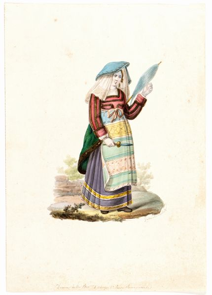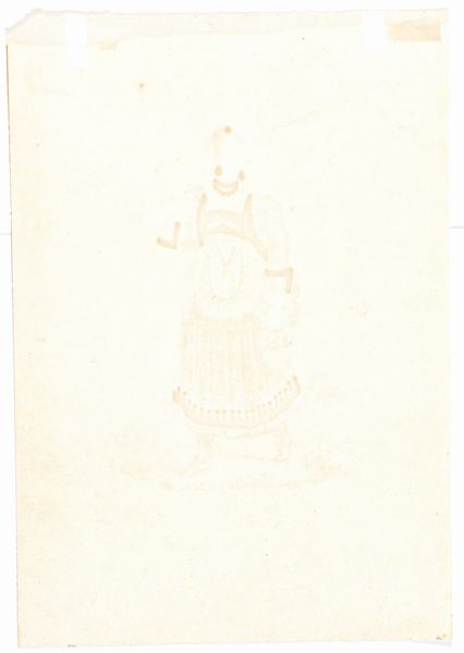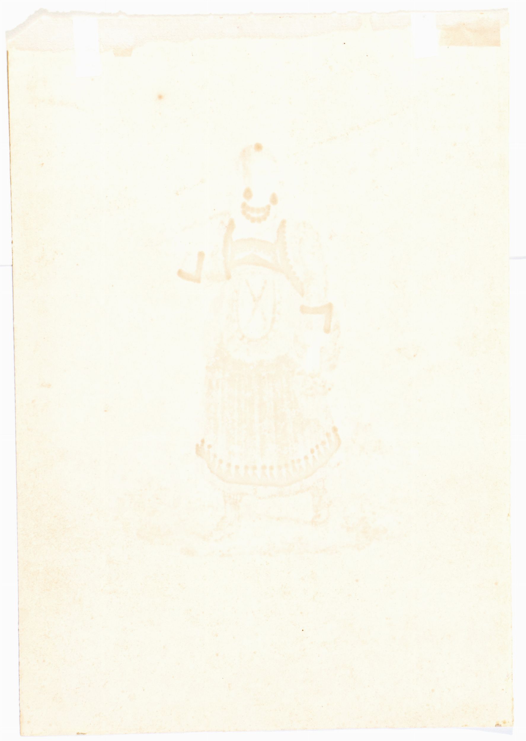 Tempera, acquerello e olio su carta bruna, cm. 29x20,2 a) Il disegno reca iscrizione al centro in basso: DONNA DELLA PROVINCIA ABRUZZO 1° PAESE DI ROCCACASALE e firma in basso a destra sotto il disegno: GABRIELE ROBATO(?); b) Il disegno reca iscrizione al centro in basso: DONNA DELLA PROVINCIA D'ABRUZZO 2° PAESE ROCCACAMELA e firma in basso a destra sotto il disegno: GABRIELE ROBATO(?)