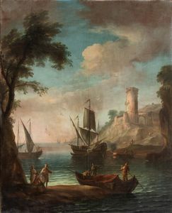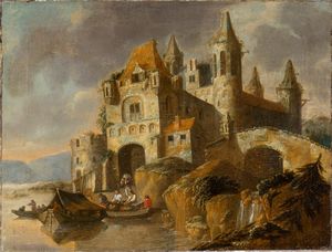Paesaggio con imbarcazioni e castello sulla riva di un fiume