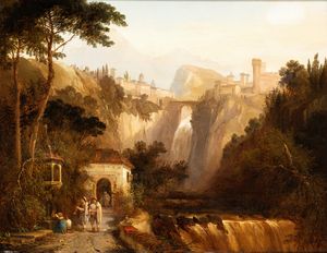 Paesaggio laziale con cascata, ponte, borgo e zampognari di fronte a un'edicola [..]