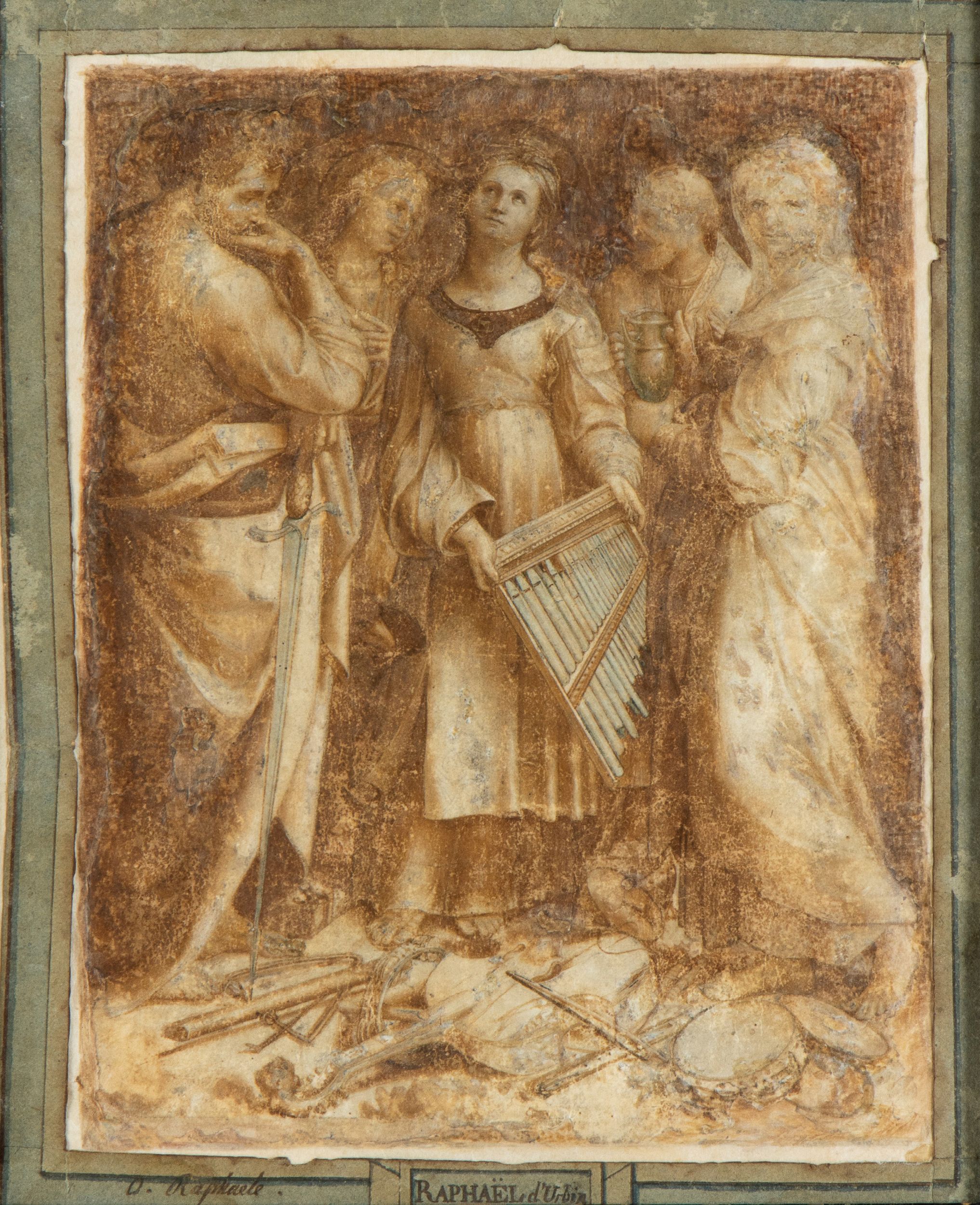 Tempera e olio su pergamena, cm. 27,5x21,5. Con cornice Il disegno deriva dal celebre dipinto di Raffaello Sanzio, con il medesimo soggetto, eseguito nel 1514 per la cappella dedicata alla Santa nella chiesa bolognese di San Giovanni in Monte, oggi conservato presso la Pinacoteca Nazionale di Bologna.