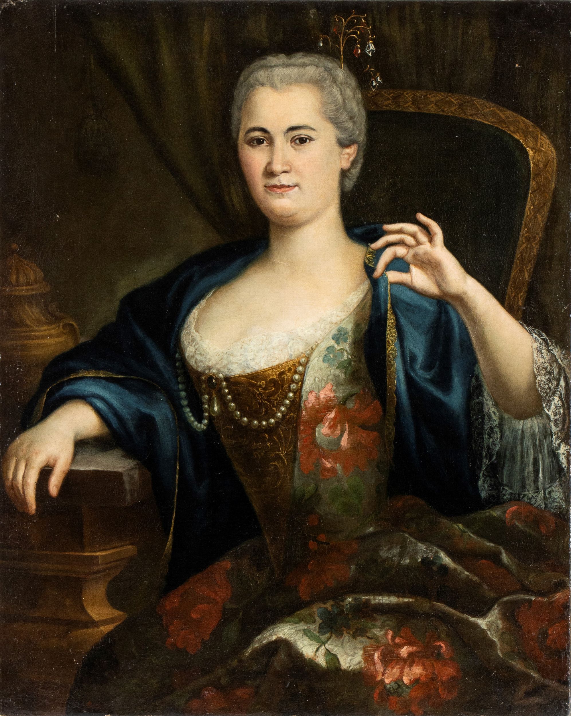 Gentildonna con collana di perle e abito a fiori