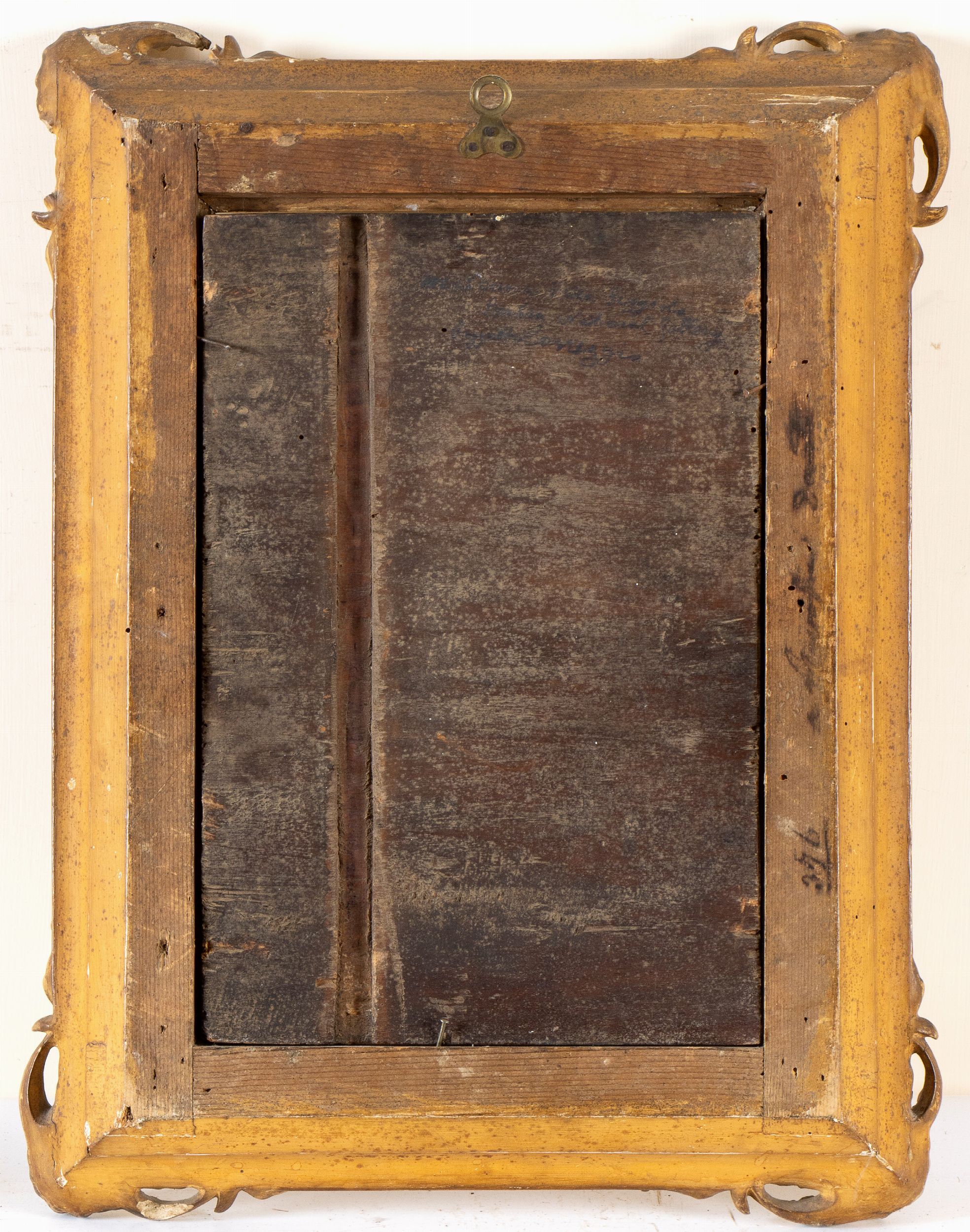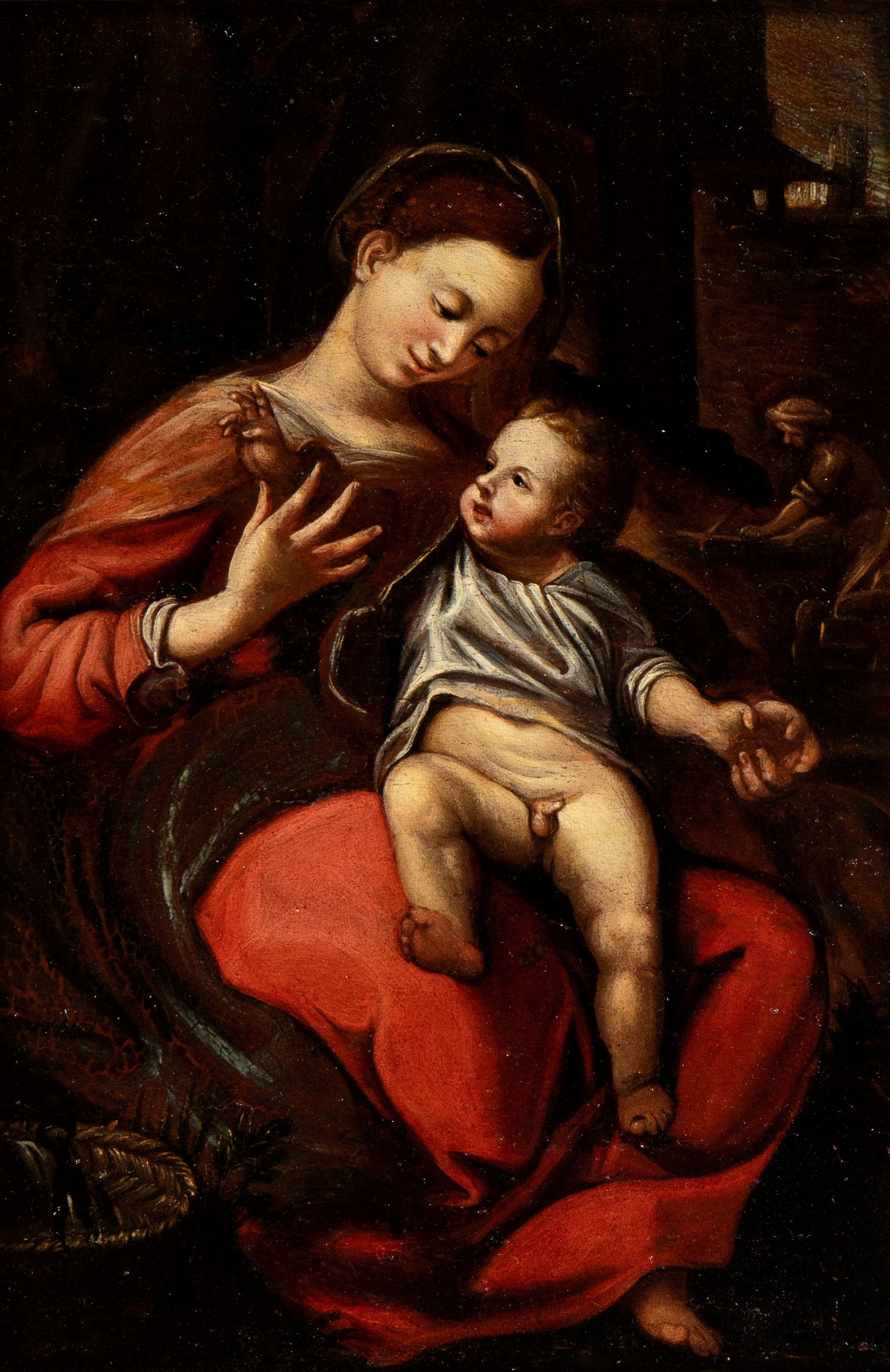 Olio su tavola, cm. 34x23. Con cornice XVI - XVII secolo Il dipinto è una buona copia antica della cosiddetta Madonna della Cesta di Correggio, oggi alla National Gallery di Londra. L'opera ebbe grande fortuna a partire dall'ultimo quarto del XVI secolo anche grazie all'incisione che ne fu tratta nel 1577 da Diana Scultori. La nostra versione è molto fedele e di dimensioni quasi identiche all'originale, ed è realizzata nello stesso verso.
