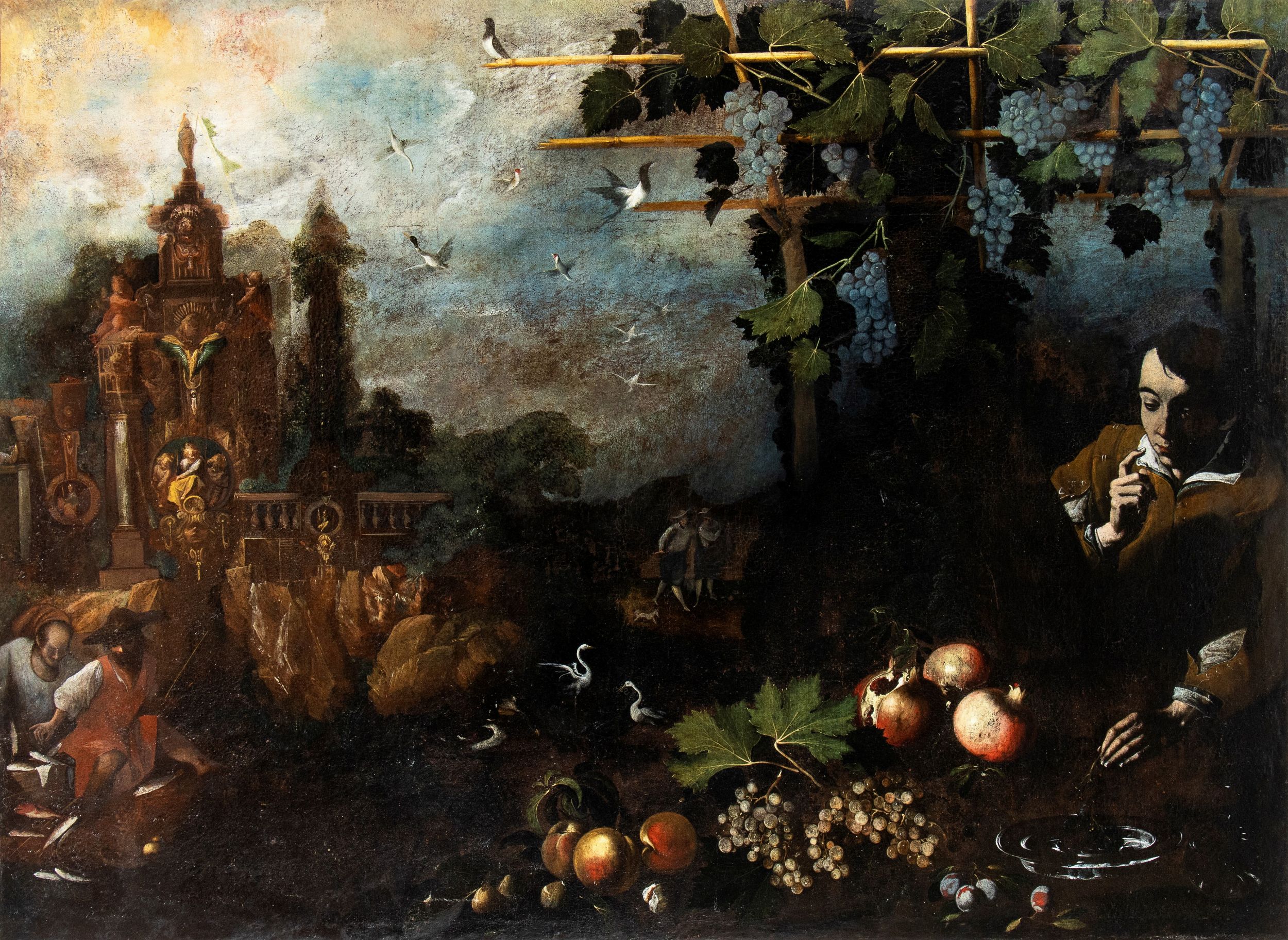 Paesaggio con natura morta e contadino in primo piano, figure e monumento fantastico [..]