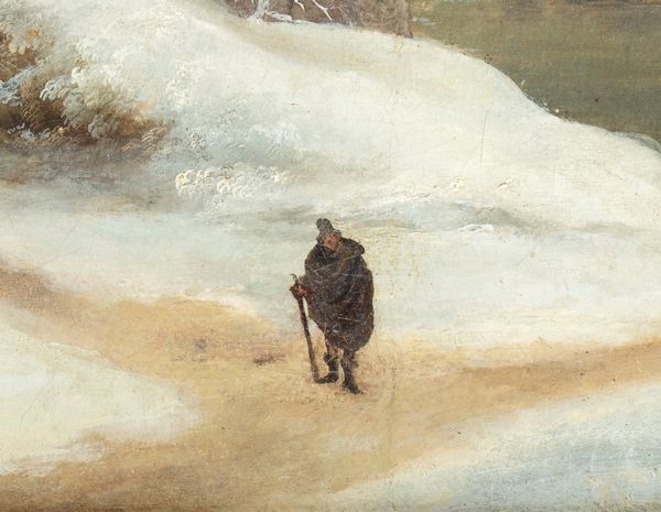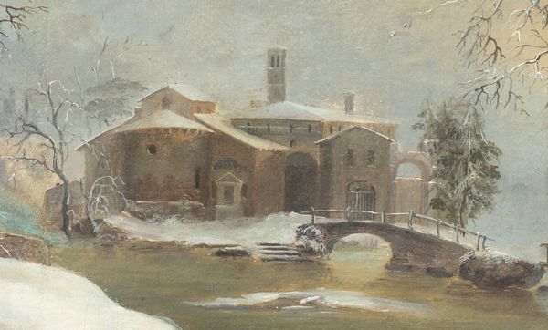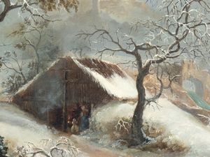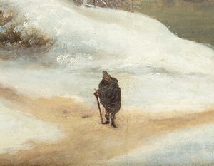 L'anconetano Francesco Foschi fu il maggiore interprete in Italia del genere spiccatamente nordico del paesaggio invernale. I suoi scenari innevati punteggiati di alberi spogli, rustici caseggiati, scarni borghi montani, laghi ghiacciati e radi viandanti sono intrisi di un intenso lirismo e di una visione malinconica della natura che si può ben definire pre-romantica. Il repertorio figurativo di Foschi si compone di pochi ingredienti che ricorrono quasi serialmente, senza che ciò determini, peraltro, un affievolirsi dell'espressione in senso puramente ripetitivo o uno scadere a maniera della sua vena poetica. La tela che qui si presenta esemplifica al più alto grado le qualità di paesaggista e l'estrema sapienza coloristica di Foschi, virtù qui esaltate dall'ammirevole essenzialità e limpidezza della composizione, con quell'unica figura al centro di un crocevia di sentieri, che s'incammina verso una meta misteriosa immerso in una natura grandiosa e inospitale. La nostra tela può essere utilmente confrontata con opere di Foschi come Viaggiatori lungo la sponda di un lago, già in collezione Fritz Heinemann (Vinci-Corsini, n. 32, p. 51), la Veduta di un cottage da una grotta (Ibid., n. 34, p. 53), Paesaggio con stazione di posta e osteria del Musée des Beaux-arts di Lille (Ibid.,n. 109, p. 114).