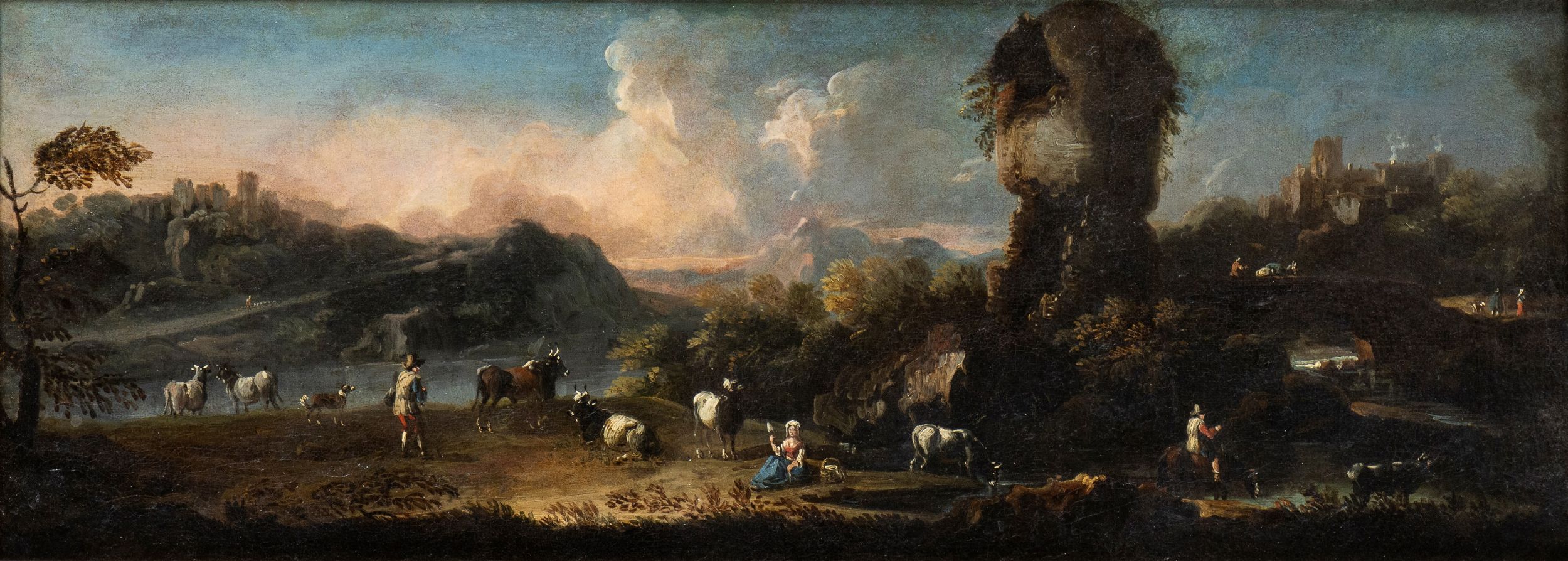 Paesaggio laziale con ponte, rudere, pastori e armenti