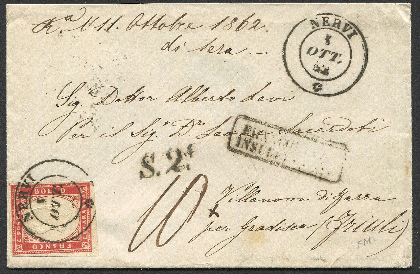 1862, Regno d’Italia, lettera da Nervi per Gradisca (Friuli) del 5 ottobre 1862