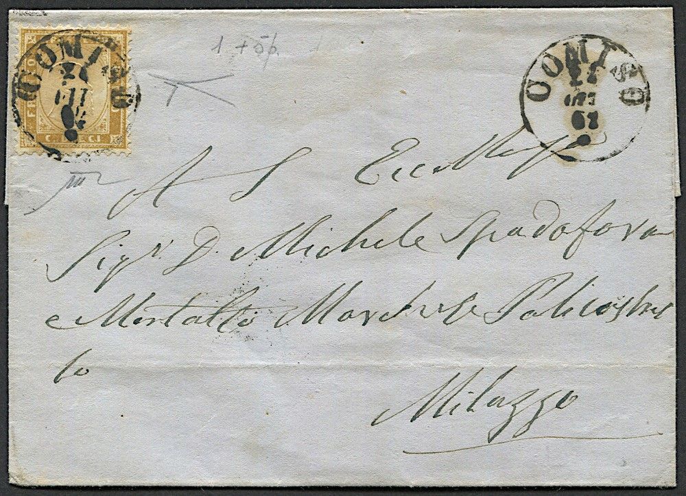 1862, Regno d’Italia, Sicilia, sovracoperta di lettera da Comiso per Milazzo del [..]