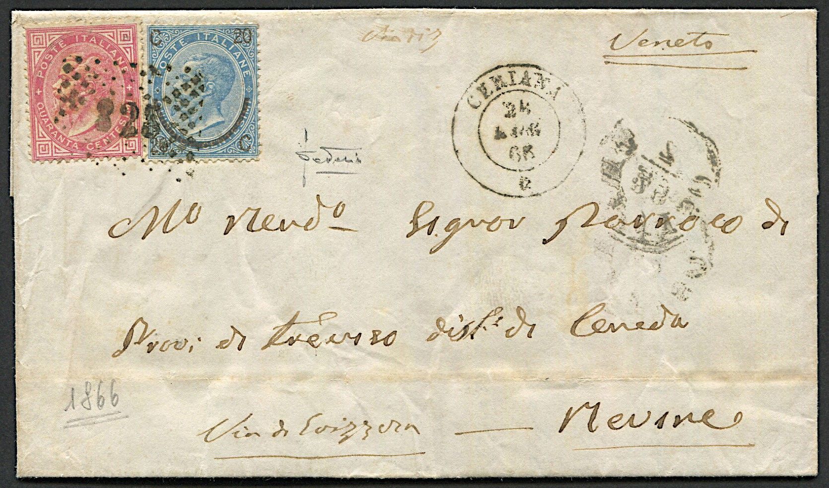 1866, Regno d’Italia, Lettera da Ceriana (Imperia) per Revine (Treviso) del 24 luglio [..]