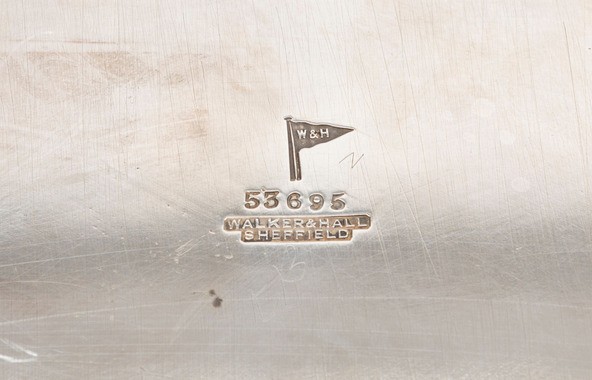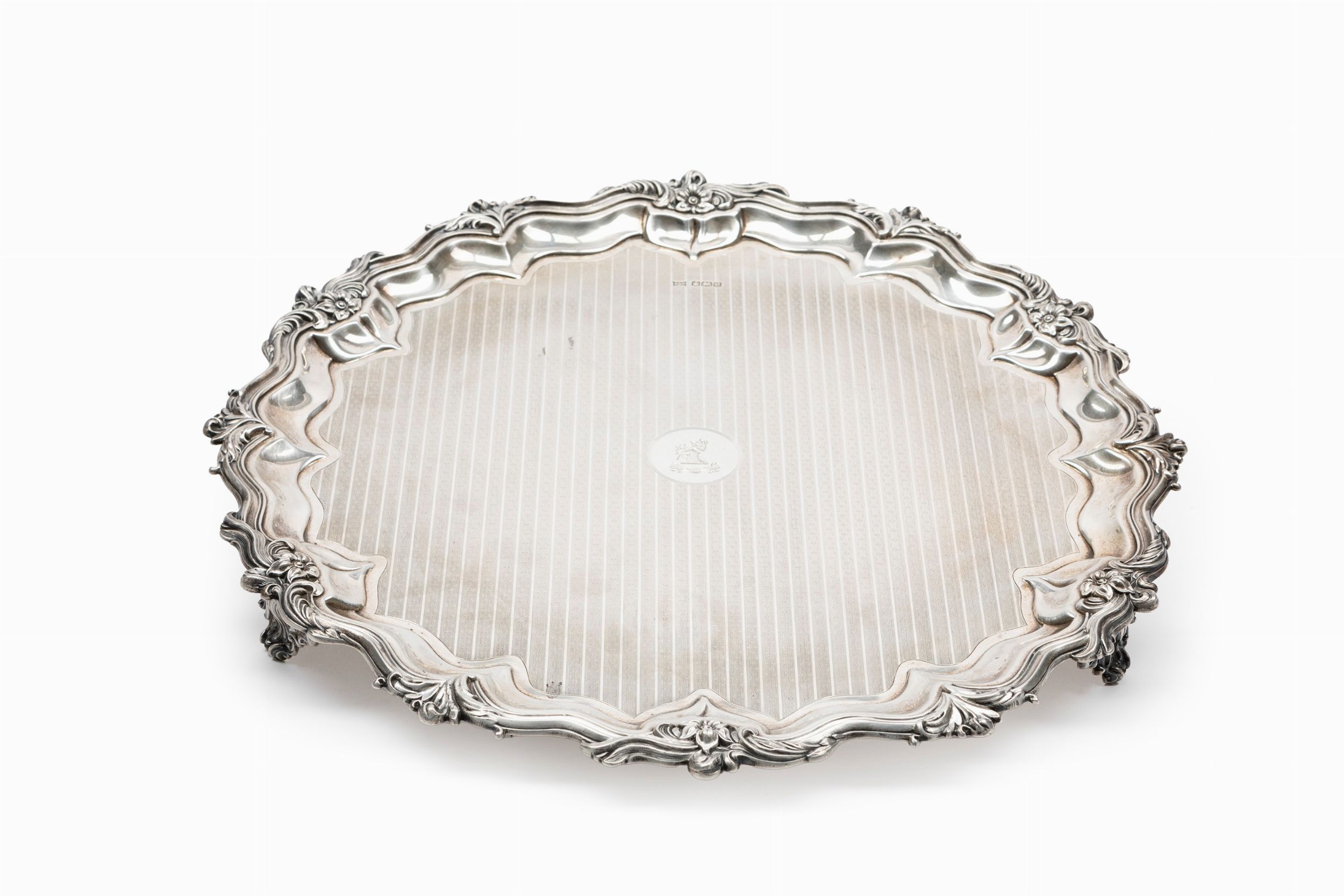 Inghilterra, XX secolo poggiante su tre piedi, di forma circolare, bordo mosso, decori floreali, centro inciso con al centro stemma
