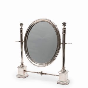 in argento e vermeil, Peso kg 1,293 (comprensivo dello specchio e degli inserti non in argento) cm 18,00x5,00-30,00x12,50-20,00x15,00-11,00x10,00 [..]