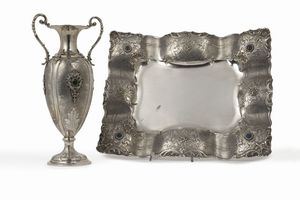 in argento, Peso kg 1,760 (comprensivo degli inserti non in argento) cm 10,00x22,00-10,00x34,00 Italia, XX secolo [..]