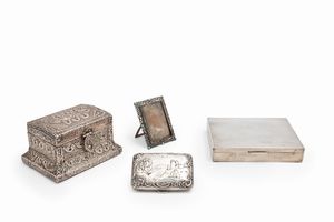 in argento 925, Peso kg 1,090 (comprensivo degli inserti non in argento) cm 24,00x15,00x4,50 Italia, XX secolo [..]