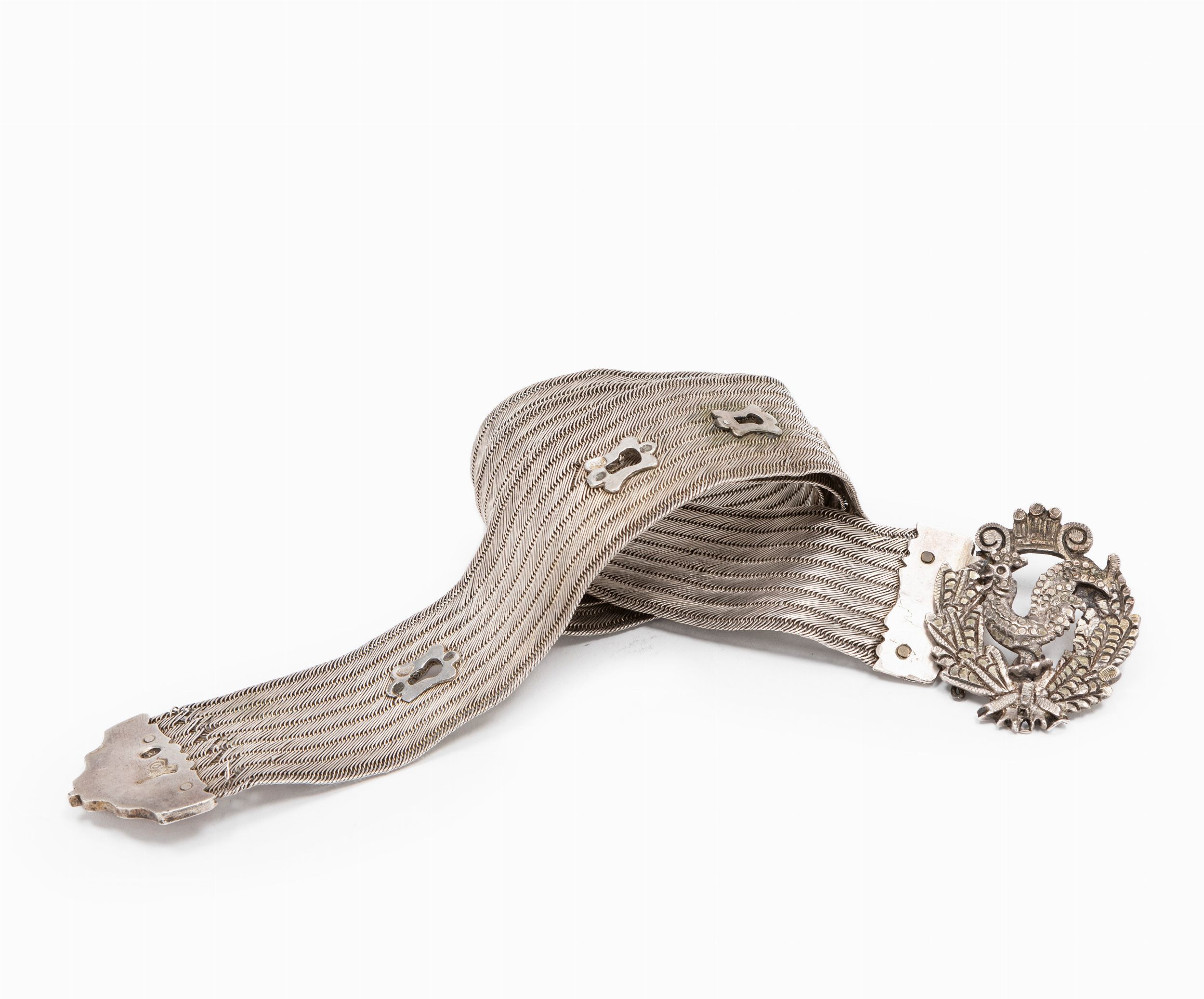 XX secolo con lavorazione a tessuto e fibbia con gallo, di gusto mediorientale.