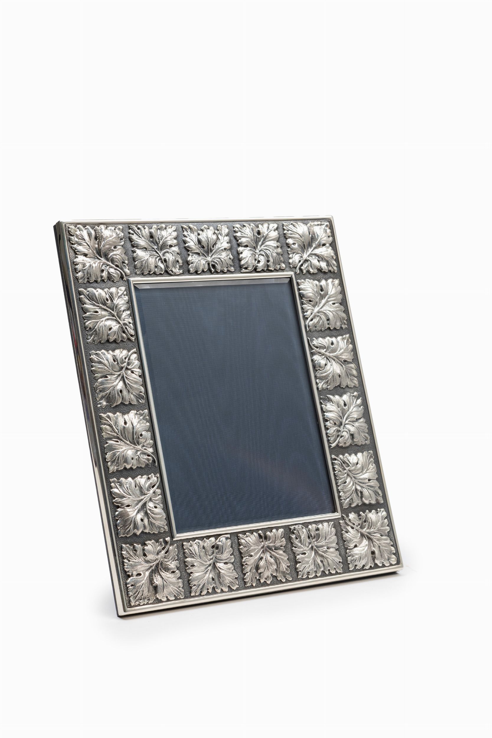in argento 925, Peso kg 1,071 (comprensivo del vetro e delle parti non in argento) cm 22,5x28,00 Italia, XX secolo decoro a rilievo con motivo a riquadri fogliacei, retro in pelle blu e legno, con scatola originale e garanzia, condizioni pari al nuovo.