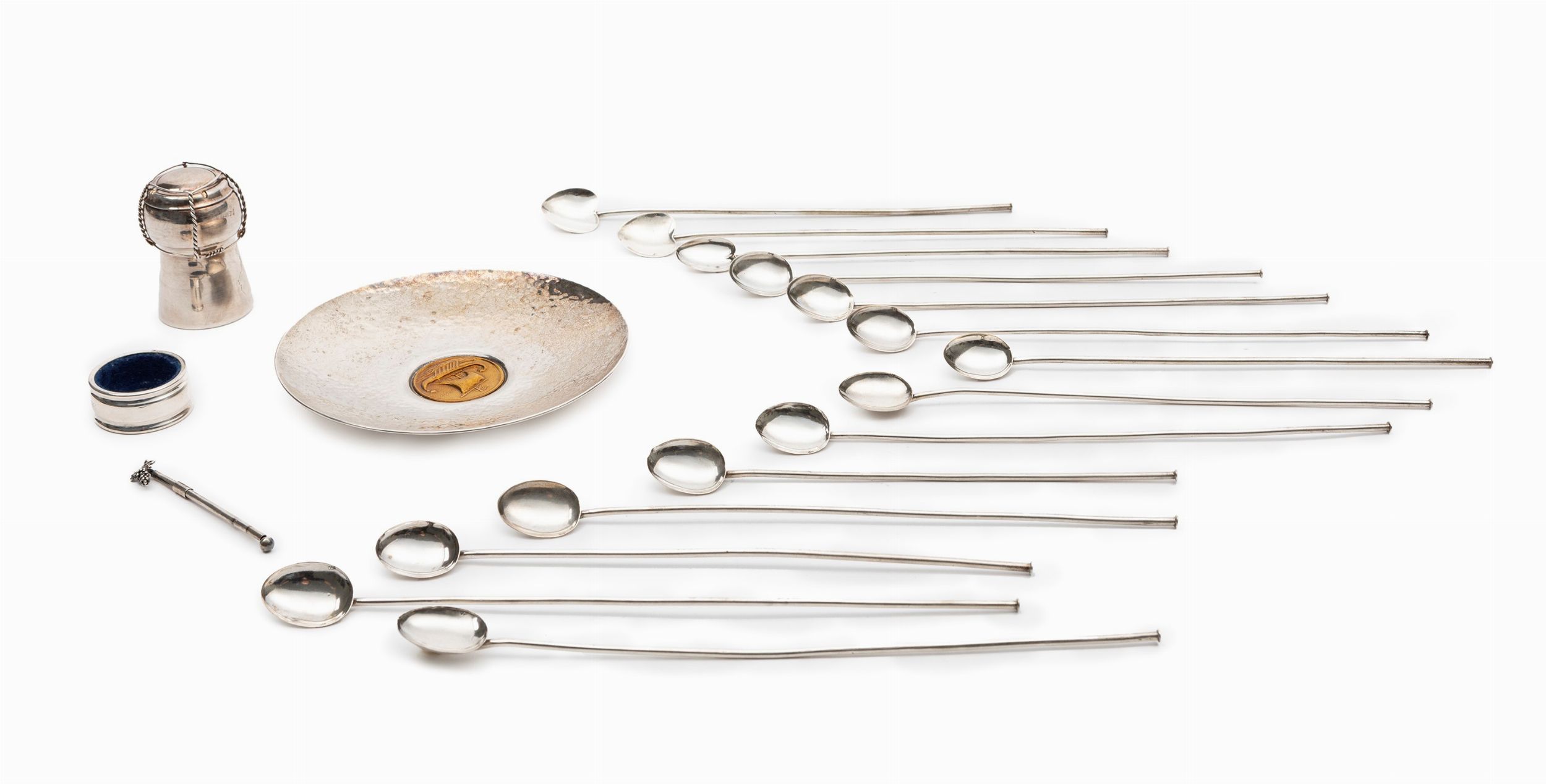 XX secolo un tappo, un salvagocce, quattordici cucchiai da shaker di servizi differenti, un piattino con al centro medaglione con veliero, e un frullino.